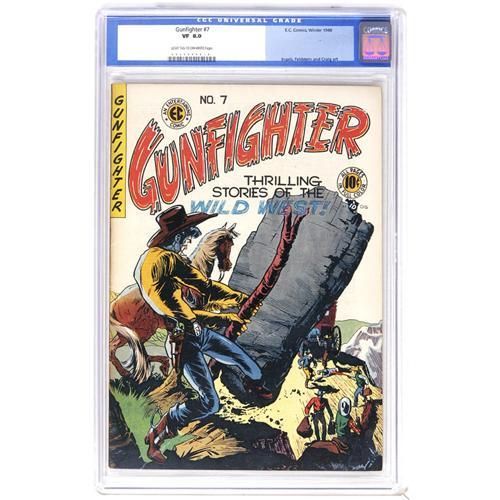 <B>Gunfighter #7 (EC, 1948) CGC VF 8.0 Light tan to off-white pages.</B></I> Graham Ingels cover. Ingels, Al Feldstein, and Johnny Craig art. Overstreet 2006 VF 8.0 value = $239. CGC census 5/06: 1 in 8.0, 1 higher. <BR><BR><B>Important notice:</B> Heritage usually auctions material at the rate of 200-250 lots per hour. On some occasions eBay Live bid software or the Internet may not be able to keep up with the pace of the auction. We recommend placing a realistic absentee bid now as insurance to avoid disappointment. Occasionally the auctioneer may eliminate or reject an eBay Live bid, and the auctioneer may also reopen a lot after the close of the eBay live bidding (usually because we missed an audience bid), and may reject your bid even if it shows you as the winning bidder. By bidding via eBay Live, you agree that Heritage may award the lot to another bidder at its sole discretion under the circumstances described above or any other reasonable circumstances. Since eBay bids are not shown to us until we open the lot on the floor, we treat those bids just like floor bids. In most cases the floor responds before the eBay bid is presented to us, due to Internet lag time, so for consistency we have made it a policy that floor bids are always considered first over tie eBay live bids. Also please note that all Heritage lots purchased through eBay Live carry a 22.5% Buyer's Premium. Please make sure you read the Terms and Conditions before you bid. This lot is being auctioned in conjunction with a live floor auction by Heritage Auction Galleries. All final auction and invoice information will be supplied by Heritage Auction Galleries, and all other information should be considered preliminary. Lot:41001 <BR><BR><B>Winning Notification and Billing:</B> After the FINAL session in this auction is complete, Heritage will send e-mail and snail mail invoices. This process normally takes several days. All final auction and invoice information will be supplied by Heritage Auction Galleries, and all other information should be considered preliminary. <BR><BR>This auction will be conducted on a live auction floor and over the Internet through eBay Live. If you choose to place an absentee bid, please take a moment to <font color='#0000ff'><u><a href='http://pages.ebay.com/liveauctions/help/before/laabsentee.html'>learn how eBay Live absentee bidding works</a></u></font><font color='#000000'>