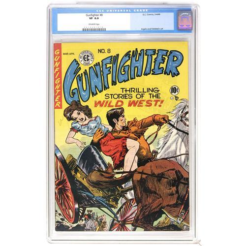 <B>Gunfighter #8 (EC, 1949) CGC VF 8.0 Off-white pages.</B></I> Graham Ingels cover. Ingels, Al Feldstein, and H. C. Kiefer art. Overstreet 2006 VF 8.0 value = $239. CGC census 5/06: 1 in 8.0, 1 higher. <BR><BR><B>Important notice:</B> Heritage usually auctions material at the rate of 200-250 lots per hour. On some occasions eBay Live bid software or the Internet may not be able to keep up with the pace of the auction. We recommend placing a realistic absentee bid now as insurance to avoid disappointment. Occasionally the auctioneer may eliminate or reject an eBay Live bid, and the auctioneer may also reopen a lot after the close of the eBay live bidding (usually because we missed an audience bid), and may reject your bid even if it shows you as the winning bidder. By bidding via eBay Live, you agree that Heritage may award the lot to another bidder at its sole discretion under the circumstances described above or any other reasonable circumstances. Since eBay bids are not shown to us until we open the lot on the floor, we treat those bids just like floor bids. In most cases the floor responds before the eBay bid is presented to us, due to Internet lag time, so for consistency we have made it a policy that floor bids are always considered first over tie eBay live bids. Also please note that all Heritage lots purchased through eBay Live carry a 22.5% Buyer's Premium. Please make sure you read the Terms and Conditions before you bid. This lot is being auctioned in conjunction with a live floor auction by Heritage Auction Galleries. All final auction and invoice information will be supplied by Heritage Auction Galleries, and all other information should be considered preliminary. Lot:41001 <BR><BR><B>Winning Notification and Billing:</B> After the FINAL session in this auction is complete, Heritage will send e-mail and snail mail invoices. This process normally takes several days. All final auction and invoice information will be supplied by Heritage Auction Galleries, and all other information should be considered preliminary. <BR><BR>This auction will be conducted on a live auction floor and over the Internet through eBay Live. If you choose to place an absentee bid, please take a moment to <font color='#0000ff'><u><a href='http://pages.ebay.com/liveauctions/help/before/laabsentee.html'>learn how eBay Live absentee bidding works</a></u></font><font color='#000000'>