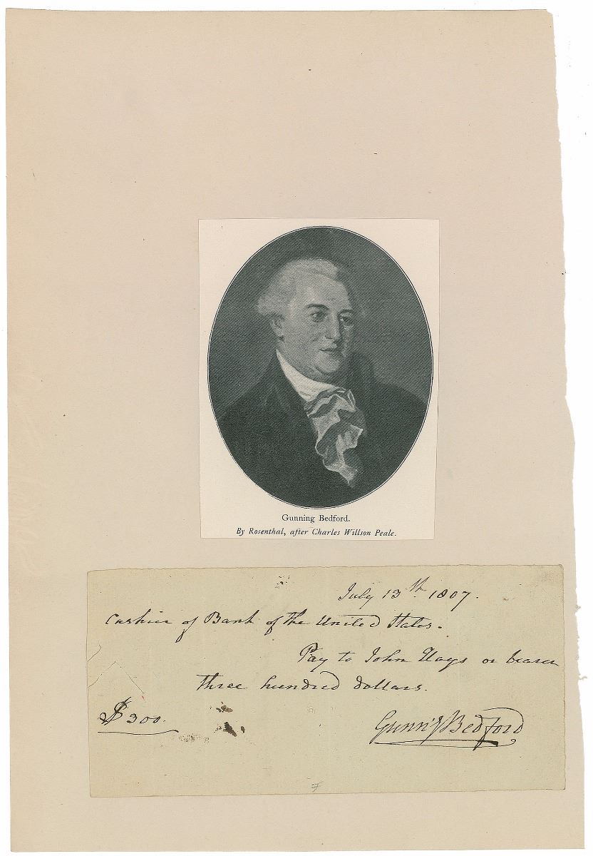 Continental Congressman from Delaware and a delegate to the 1787 US Constitutional Convention (1747–1812). Manuscript DS, signed “Gunning Bedford,” one page, 6.25 x 3, July 13, 1807. Pay order issued to the cashier of the Bank of the United States, in full: “Pay to John Mays or bearer Three hundred dollars, $300.” Affixed to a 7.5 x 11 sheet bearing an image of Bedford. In fine condition.