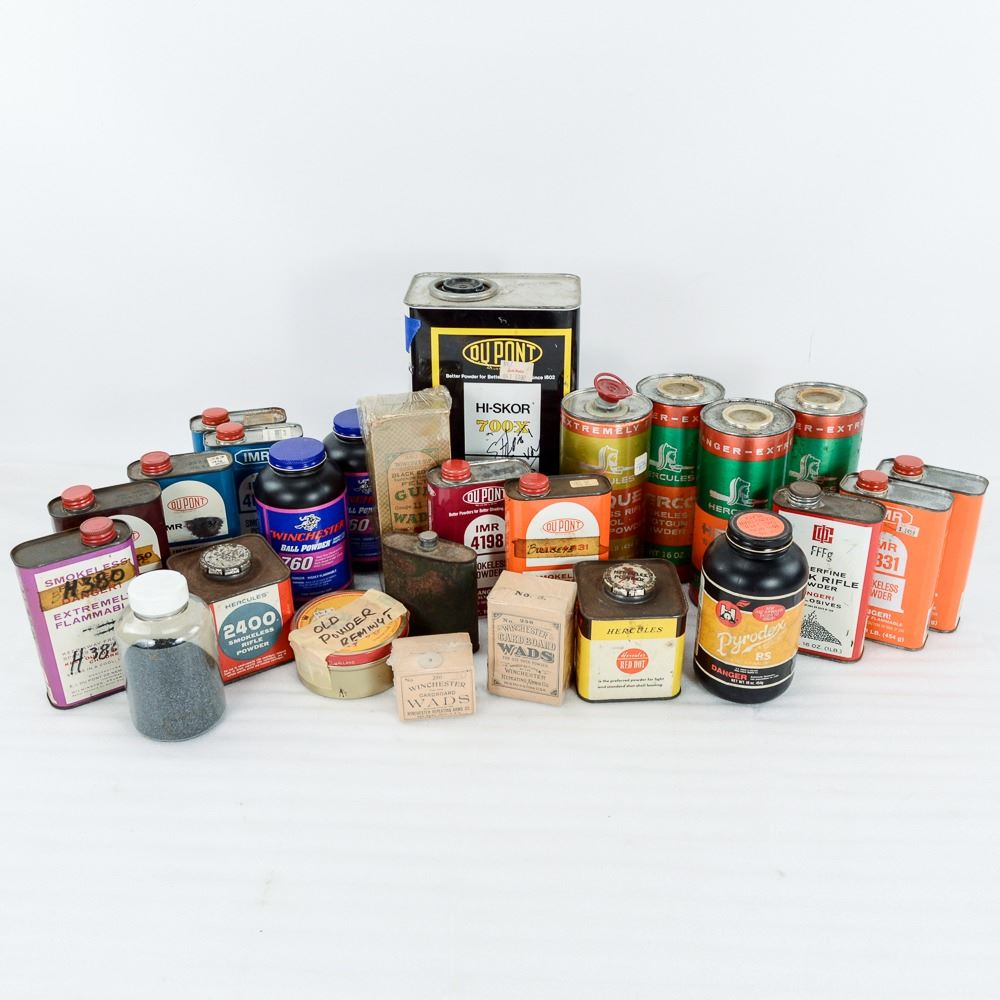 CANNOT SHIP - LOCAL PICK UP ONLY! Includes Hercules Unique shotgun powder, Hercules smokeless shotgun powder, Hercules herco shotgun powder, Pyrodex RS, Dupont IMR 4198, IMR 4064, GOI superfine black rifle powder, Winchester 760, and 3 vintage boxes of Winchester gun wads.