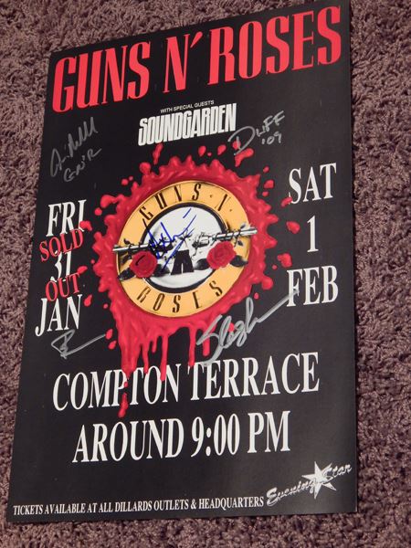 You are bidding on an 11x17 concert poster signed by Axl Rose, Slash, Izzy Stradlin, Duff McKagan, and Steven Adler. This item comes with a Certificate of Authenticity guaranteed for the life of the piece.