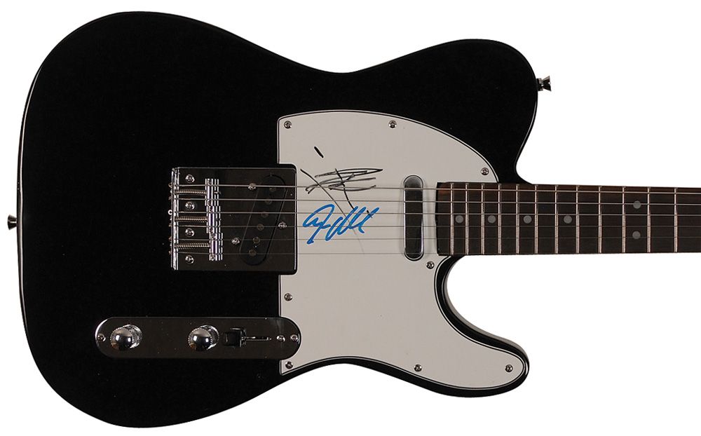 Black-bodied Stedman Pro ‘telecaster-style’ electric guitar, signed on the white pickguard in black felt tip by Axl Rose, first name only, and in blue felt tip by Steven Adler. In fine condition, with a light brush to Axl’s signature. Oversized.