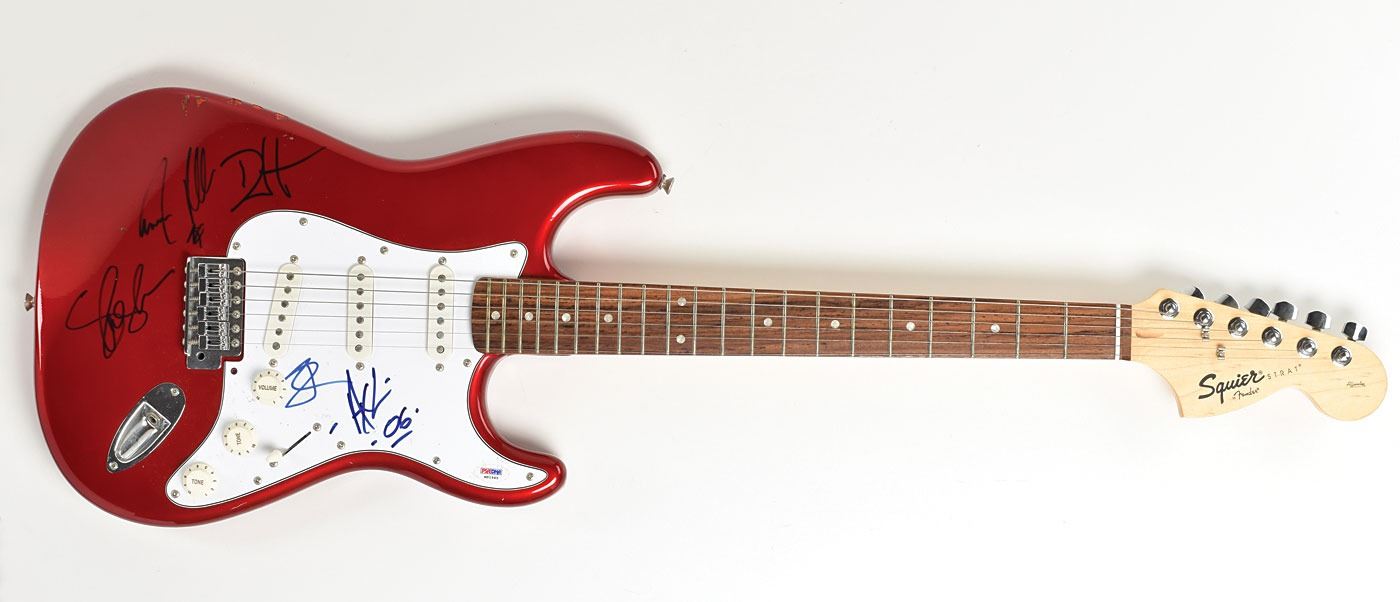 Red-bodied Affinity series Fender Squier Stratocaster electric guitar, signed on the white pickguard in blue felt tip by Axl Rose, who adds "06," and Izzy Stradlin, and on the body in blue felt tip by Slash, Duff, and Steven Adler. In very good to fine condition, with an affixed PSA/DNA label and light scuffing to the pickguard, and some dings to the body. Accompanied by a Fender gig bag.