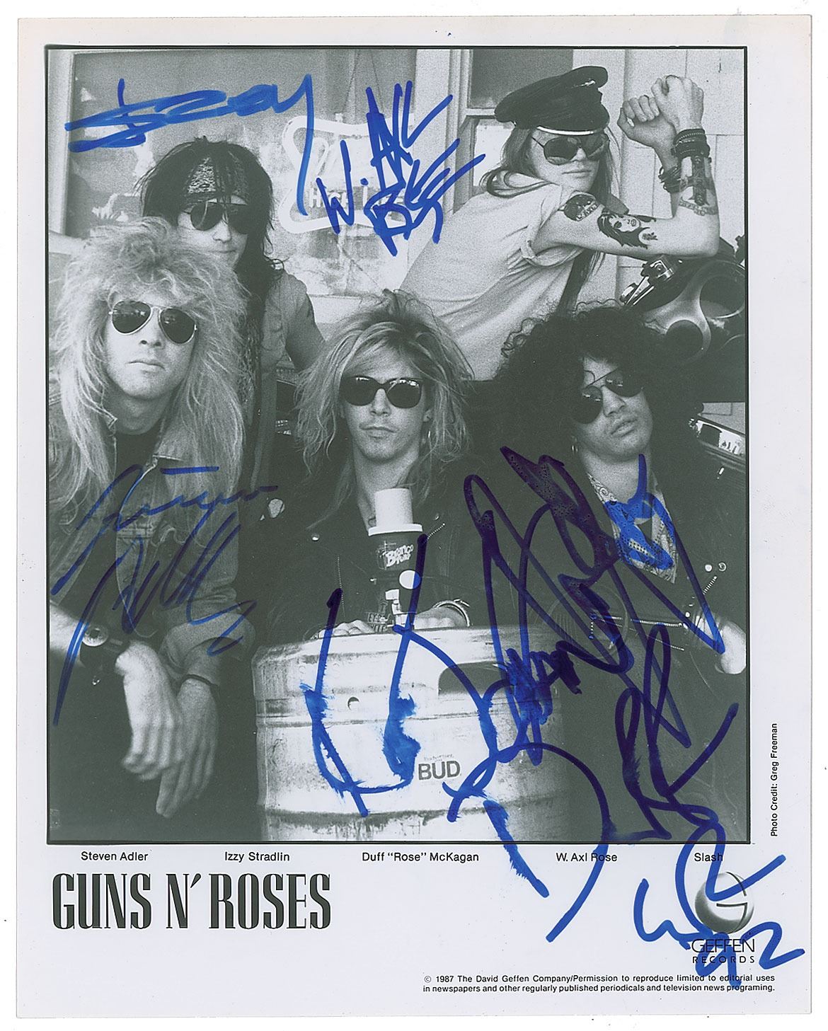 Satin-finish 8 x 10 Geffen Records publicity photo of Guns N' Roses following the release of Appetite for Destruction, signed and inscribed in blue felt tip, "To John, Duff, GR 92," "W. Axl Rose," "Slash," "Izzy," and "Steven Adler." In fine condition, with smudging to Duff's signature and inscription.