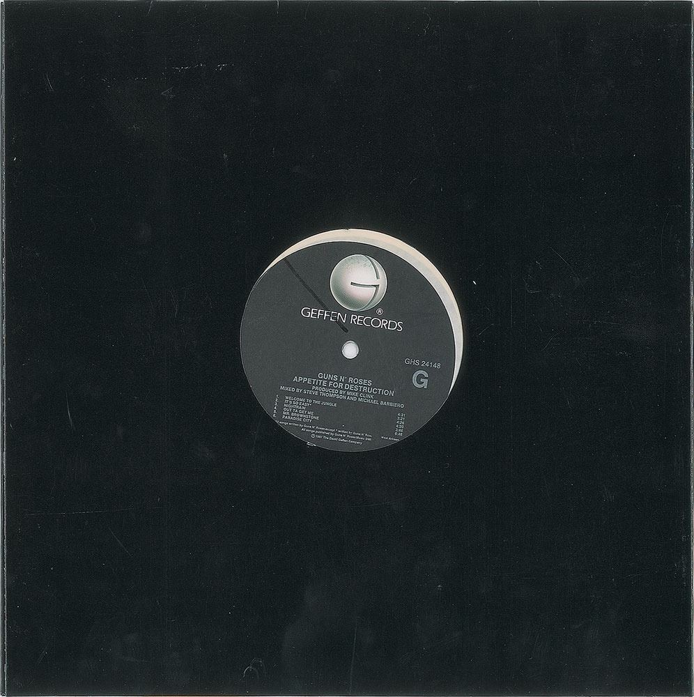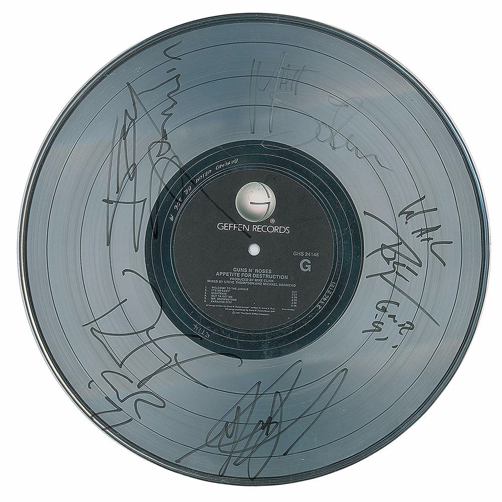 Scarce silver-coated disc for the Guns N' Roses debut album Appetite for Destruction, nicely signed in black felt tip, "W. Axl Rose, G n R, '91,'" "Izzy Stradlin," "Matt Sorum," "Duff, GR, '91," and "Slash." Consignor notes that the record was made to be used for an RIAA platinum sales award; the disc itself, despite the presence of the Appetite for Destruction label, actually features music for a religious album. In fine condition.