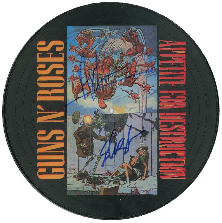 Appetite for Destruction picture disk album signed on the disc in blue felt tip by Slash and Axl Rose. In fine condition. The cover is not included.
