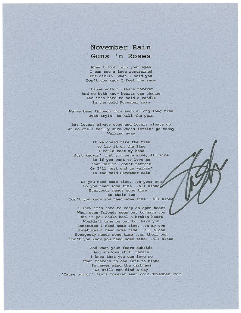 Souvenir printed lyrics to ‘November Rain,’ on a light blue 8.5 x 11 sheet, signed in black felt tip by Slash. In fine condition.