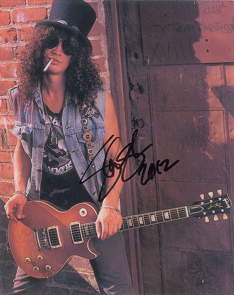 Color satin-finish 8 x 10 photo of Slash posing against a brick wall, signed in person in black felt tip, “Slash 2012.” In fine condition. Originally obtained by in-person specialist Mike Wehrmann.