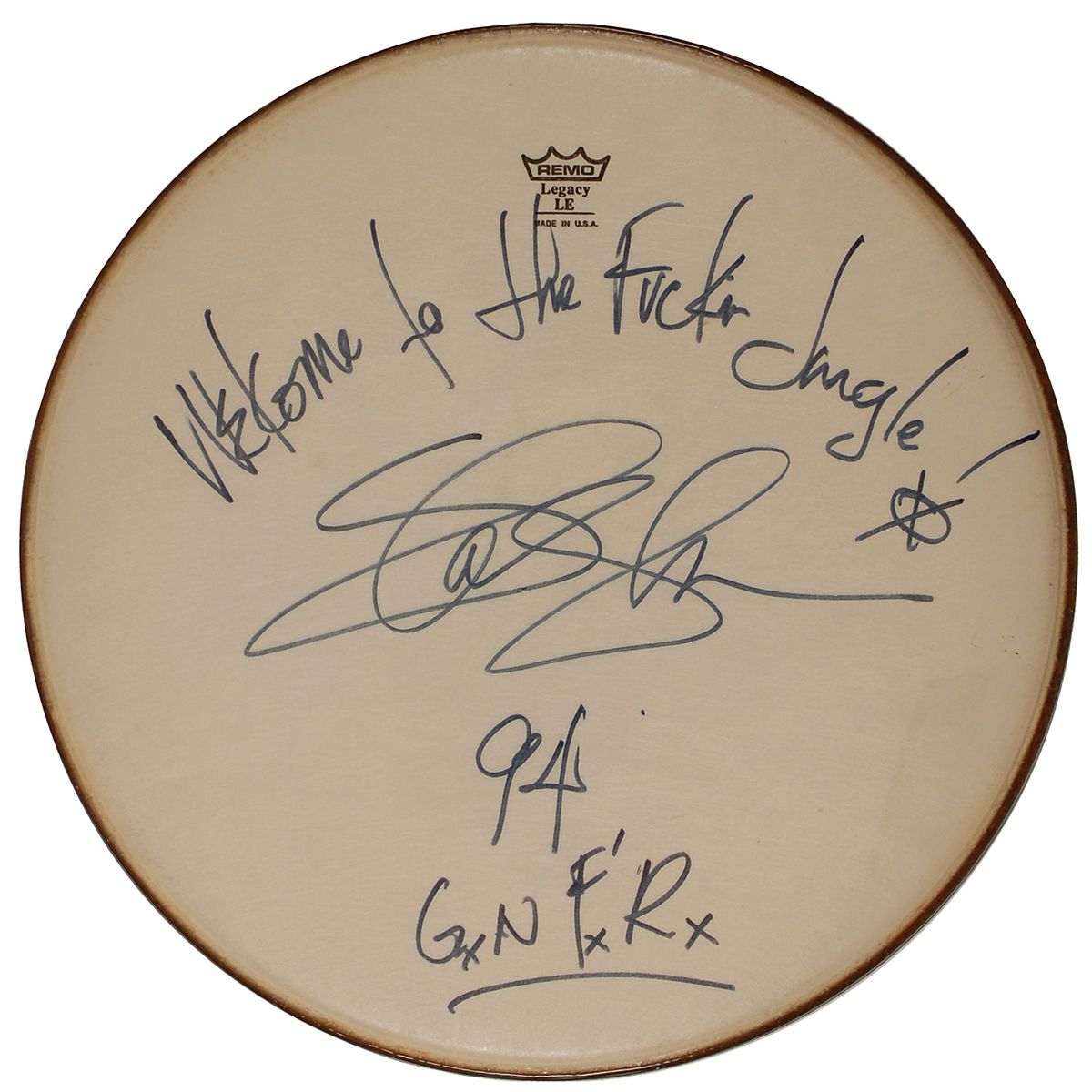Unused off-white 15” Remo drumhead, signed in black felt tip, “Welcome to the Fuckin’ jungle, Slash ‘94, G.N.F.R.” In fine condition.