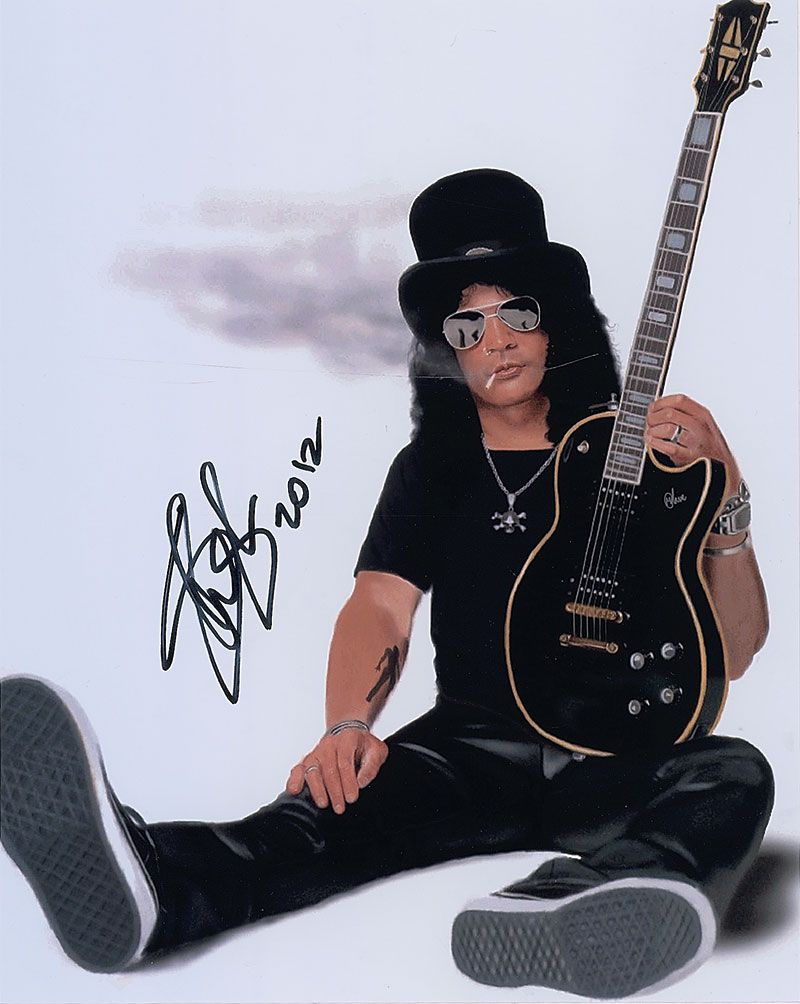 Color satin-finish 11 x 14 photo of Slash with his signature top hat and guitar, signed in-person in black felt tip, “Slash 2012.” In fine condition, with a slightly grainy quality to the image. Originally obtained by in-person specialist Mike Wehrmann.