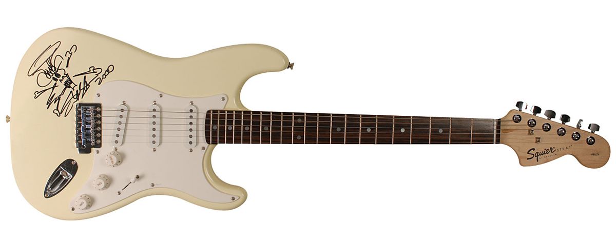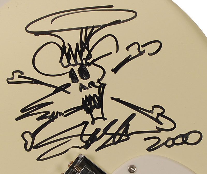 Cream-colored Fender Squier ‘stratocaster-style’ electric guitar, signed in-person on the body in black felt tip by Slash, “Slash 2000,” adding a great skull and crossbones sketch above his signature. In fine condition. Originally obtained by in-person specialist Mike Wehrmann.