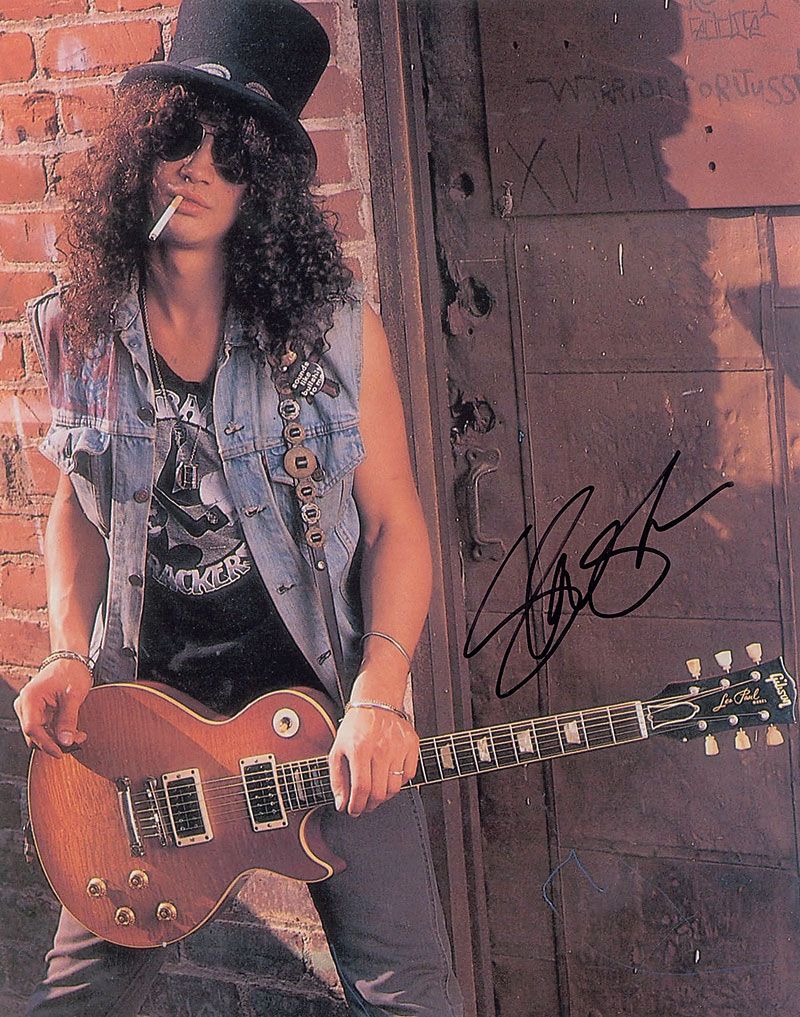 Color satin-finish 11 x 14 photo of Slash posing in an alley with his guitar, signed in person in black felt tip. In very fine condition. Originally obtained by in-person specialist Mike Wehrmann.