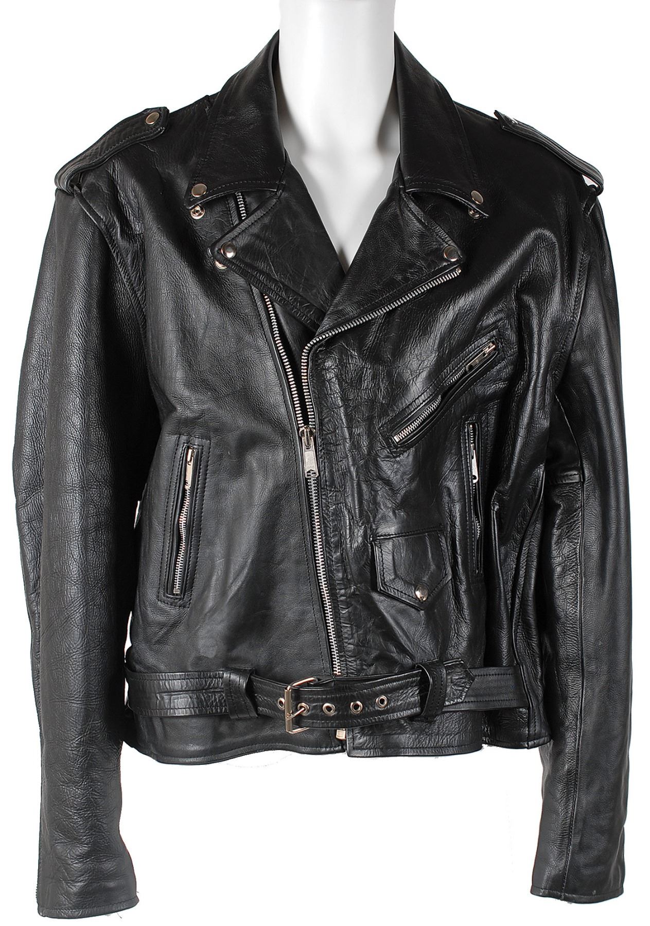 Black leather Guns N' Roses tour jacket, size 52, manufactured by Schmooze Tour Wear, featuring the band's large and colorful emblem on the back. In fine condition.