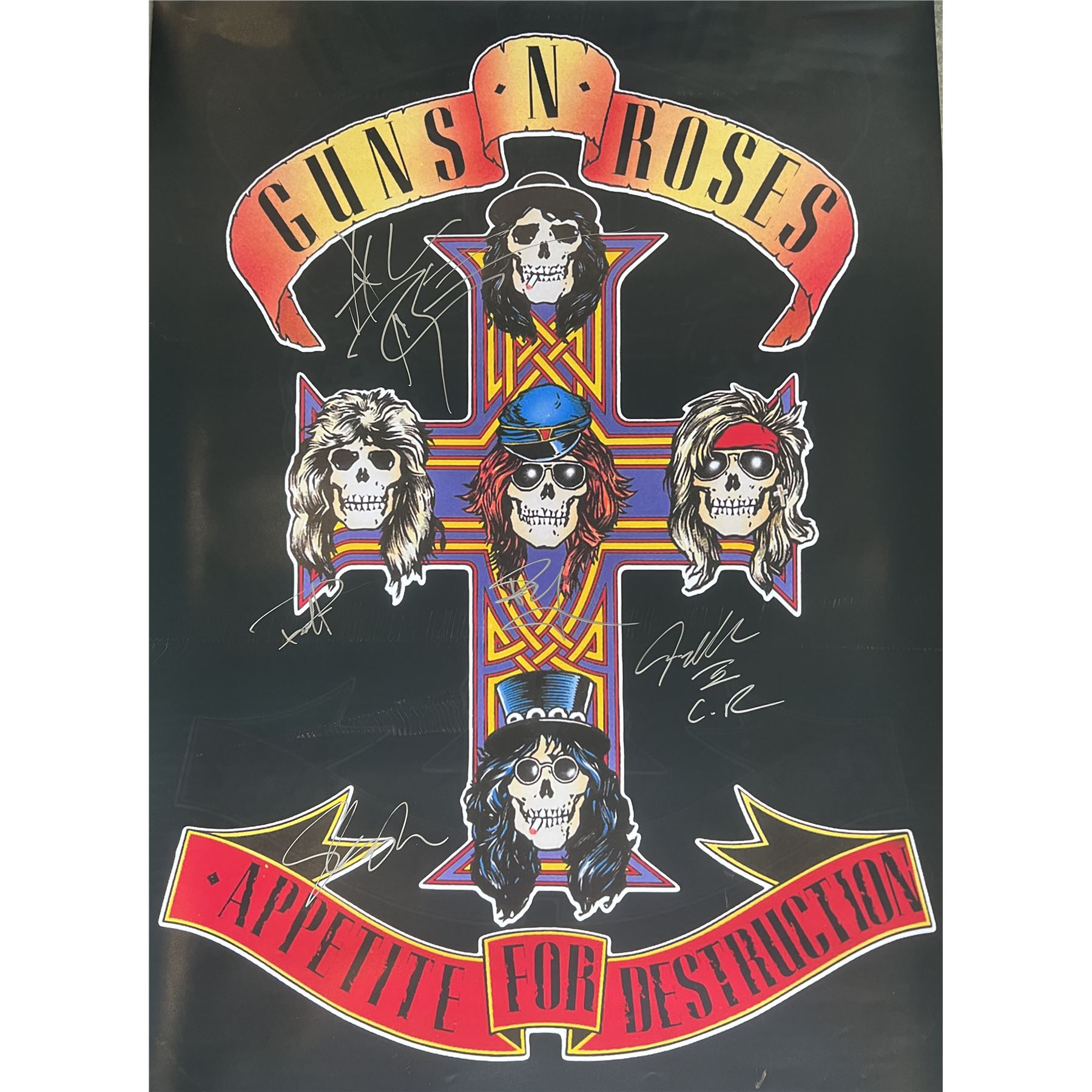 Guns N' Roses band signed poster autographed by Axl Rose, Slash, Izzy Stradlin, Duff McKagan, and Steven Adler. 24x36 inches