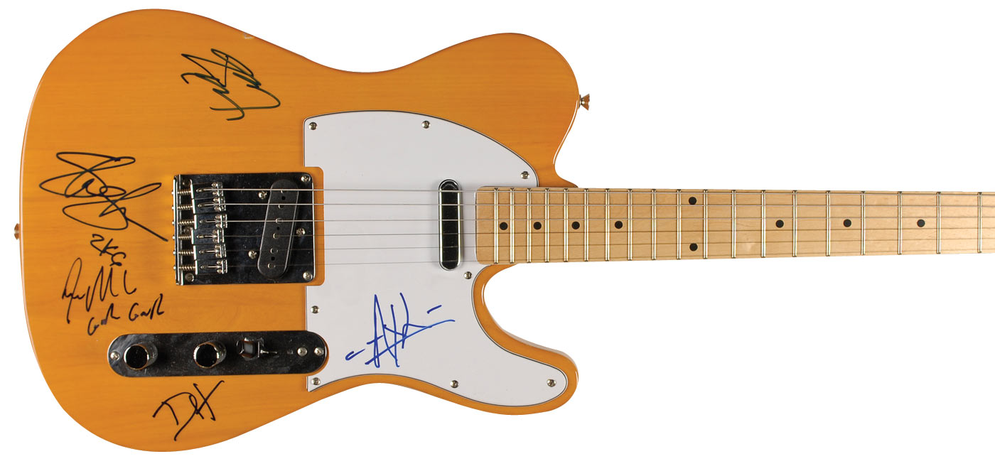 Wood-finish Stedman Pro ‘telecaster-style’ electric guitar signed on the body in blue felt tip by Slash, Duff, Steven Adler, and Izzy Stradlin and on the white pickguard by Axl Rose. In fine condition, with a couple dings to edges. Accompanied by five photos taken at time of signing. Oversized.