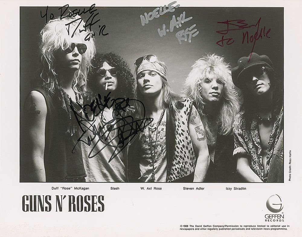 Satin-finish 10 x 8 Geffen Records group photo, signed and inscribed in silver ink to Noelle by Axl Rose, in black felt tip by Slash and Duff [McKagan], and in red felt tip by Izzy [Stradlin]. In fine condition, with some light contrast to Izzy’s signature.
