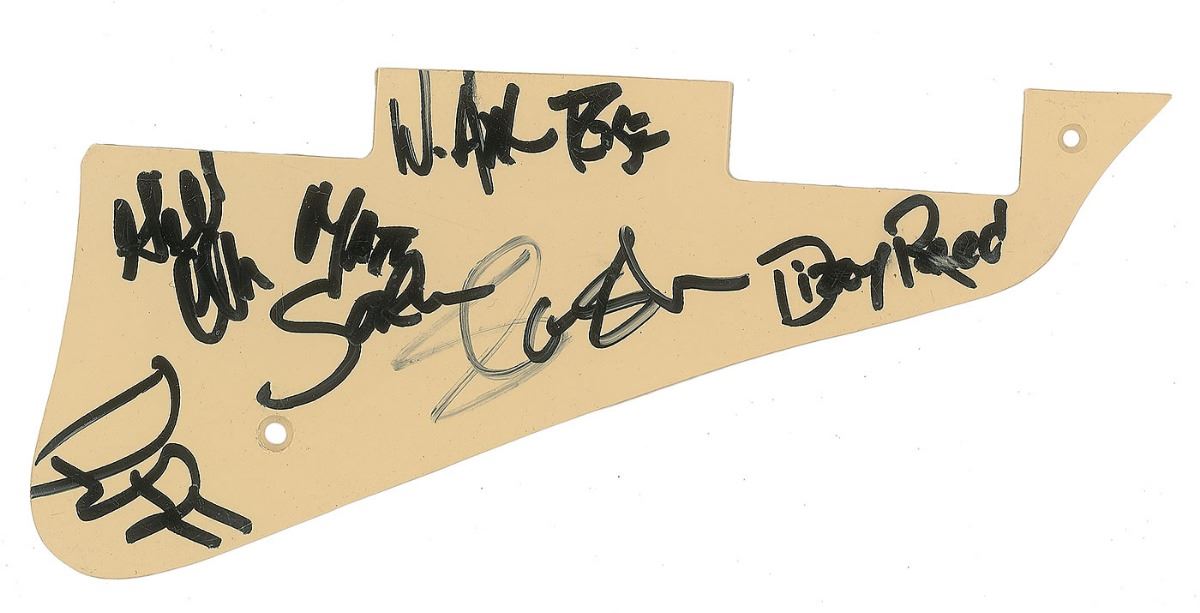 Off-white Les Paul-style pickguard, signed in black felt tip, “Hell Oh, Matt Sorum,” “W. Axl Rose,” “Duff,” “Slash,” and “Dizzy Reed.” In fine condition.