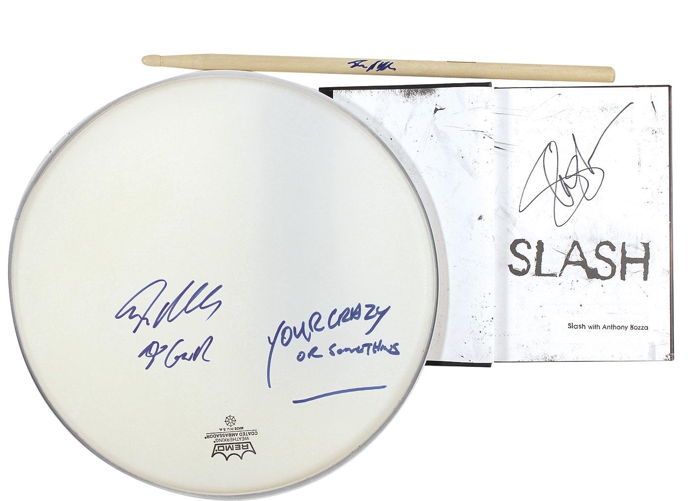 Three items: hardcover edition of Slash, signed on the title page in black felt tip, “Slash”; and an Ambassador coated unused Remo 14” drumhead and a Sound percussion 5A drumstick, both signed in felt tip by Steven Adler, adding “Your crazy or something,” to the drumhead. In fine condition. Pre-certified Roger Epperson/REAL and RRAuction COA.