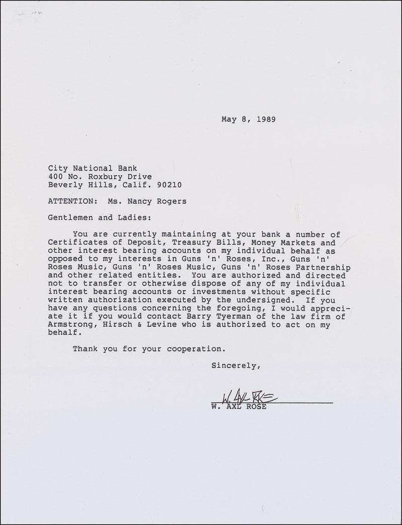 DS, signed “W. Axl Rose,” one page, 8.5 x 11, May 8, 1989. The singer contacts City National Bank executives regarding several accounts. In part: “You are currently maintaining at your bank a number of Certificates of Deposit, Treasury Bills, Money Markets and other interest bearing accounts on my individual behalf as opposed to my interests in Guns ‘n’ Roses, Inc., Guns ‘n’ Roses Music, Guns ‘n’ Roses Partnership and other related entities. You are authorized and directed not to transfer or otherwise dispose of any of my individual interest bearing accounts or investments without specific written authorization executed by the undersigned.” In fine condition, with light handling creasing and a staple hole at the top left corner.