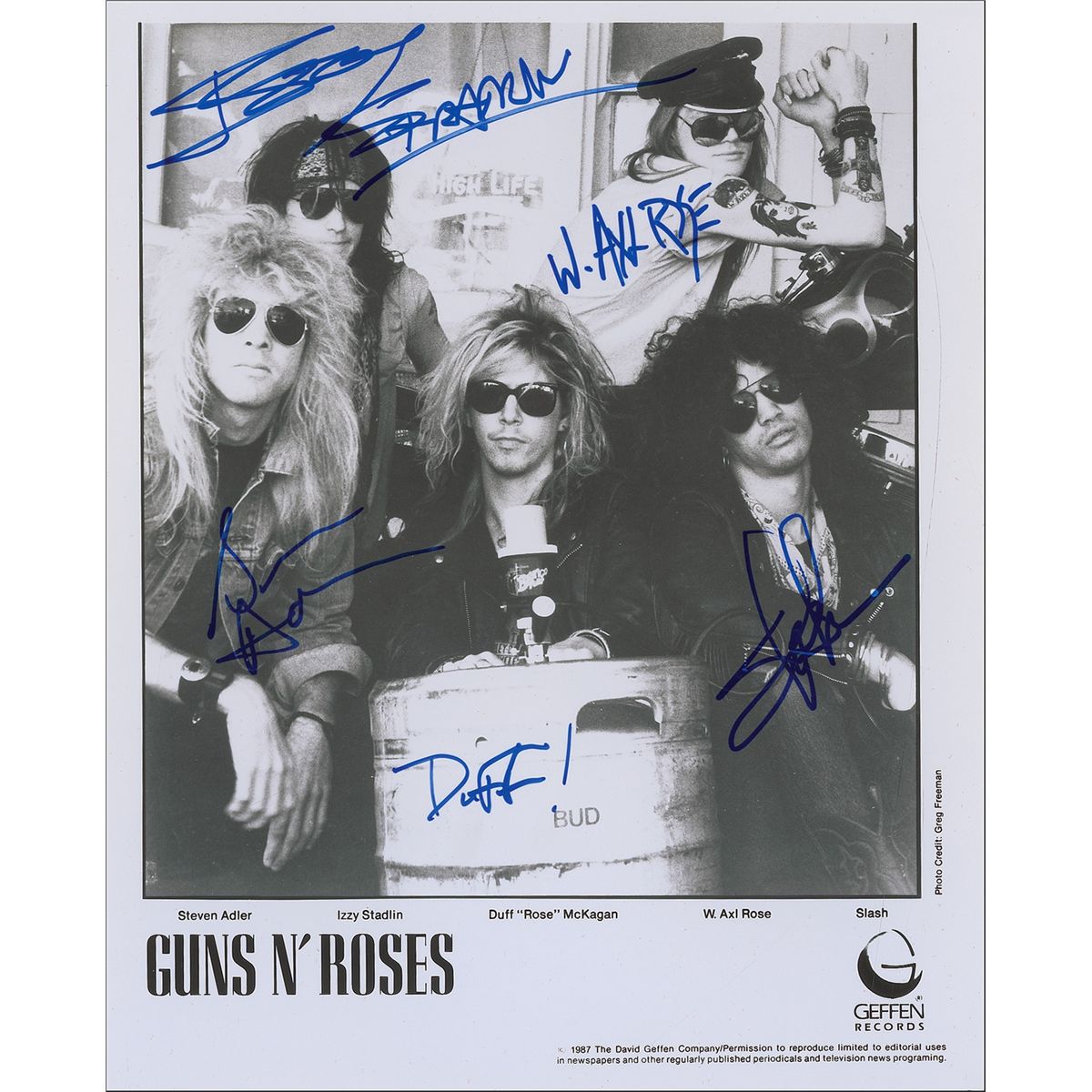Glossy 8 x 10 Geffen Records publicity photo, signed in blue felt tip by Axl Rose, Slash, Duff, Steven Adler, and Izzy Stradlin. In fine condition.