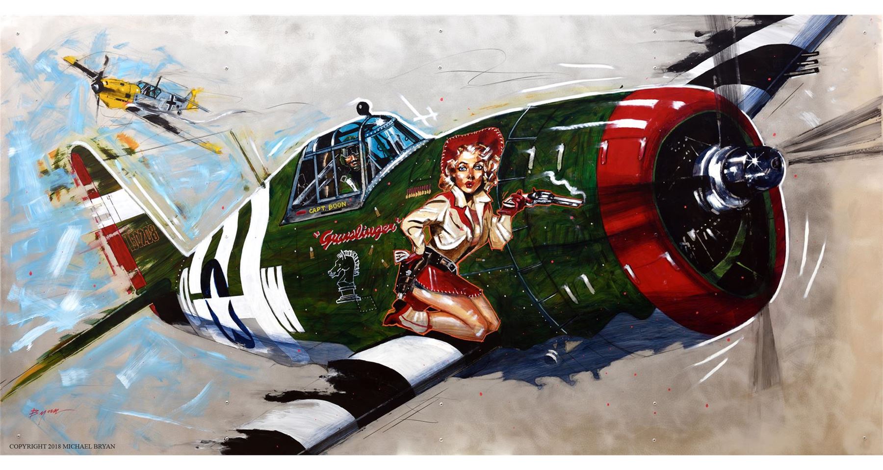 Michael Bryan's WWII fighter is adorned with a cowgirl pin-up as it heads into battle. A Unique 20x40" hand-worked giclee on canvas, it is numbered 1/1.
