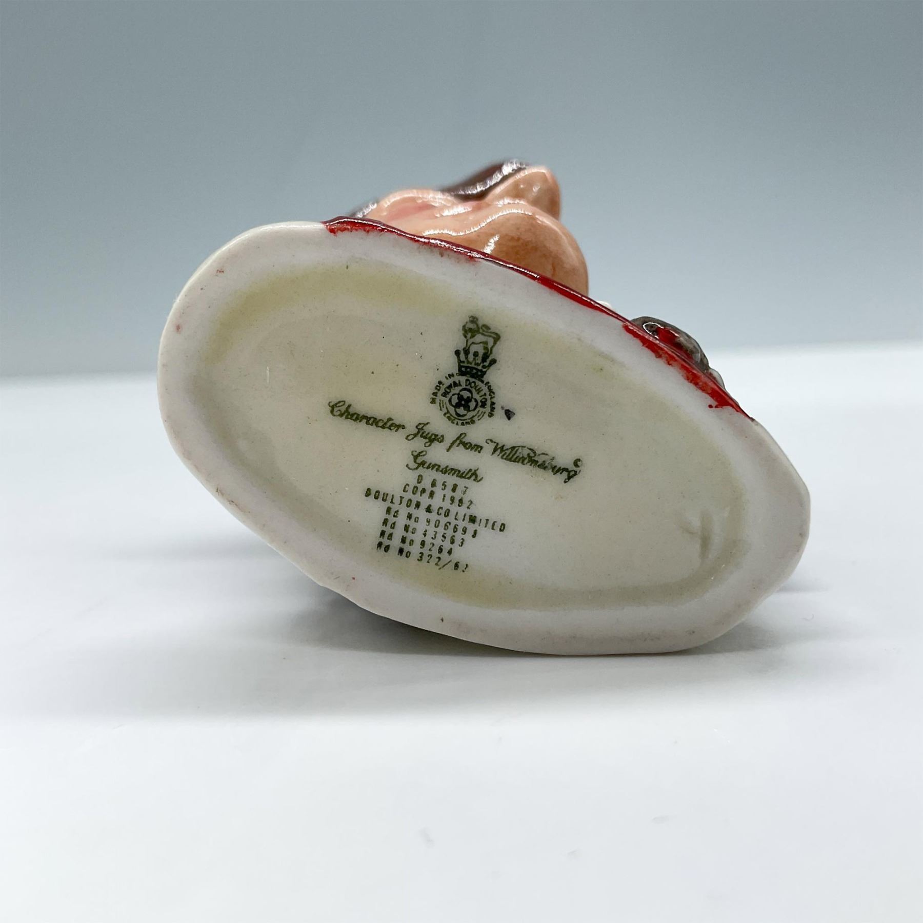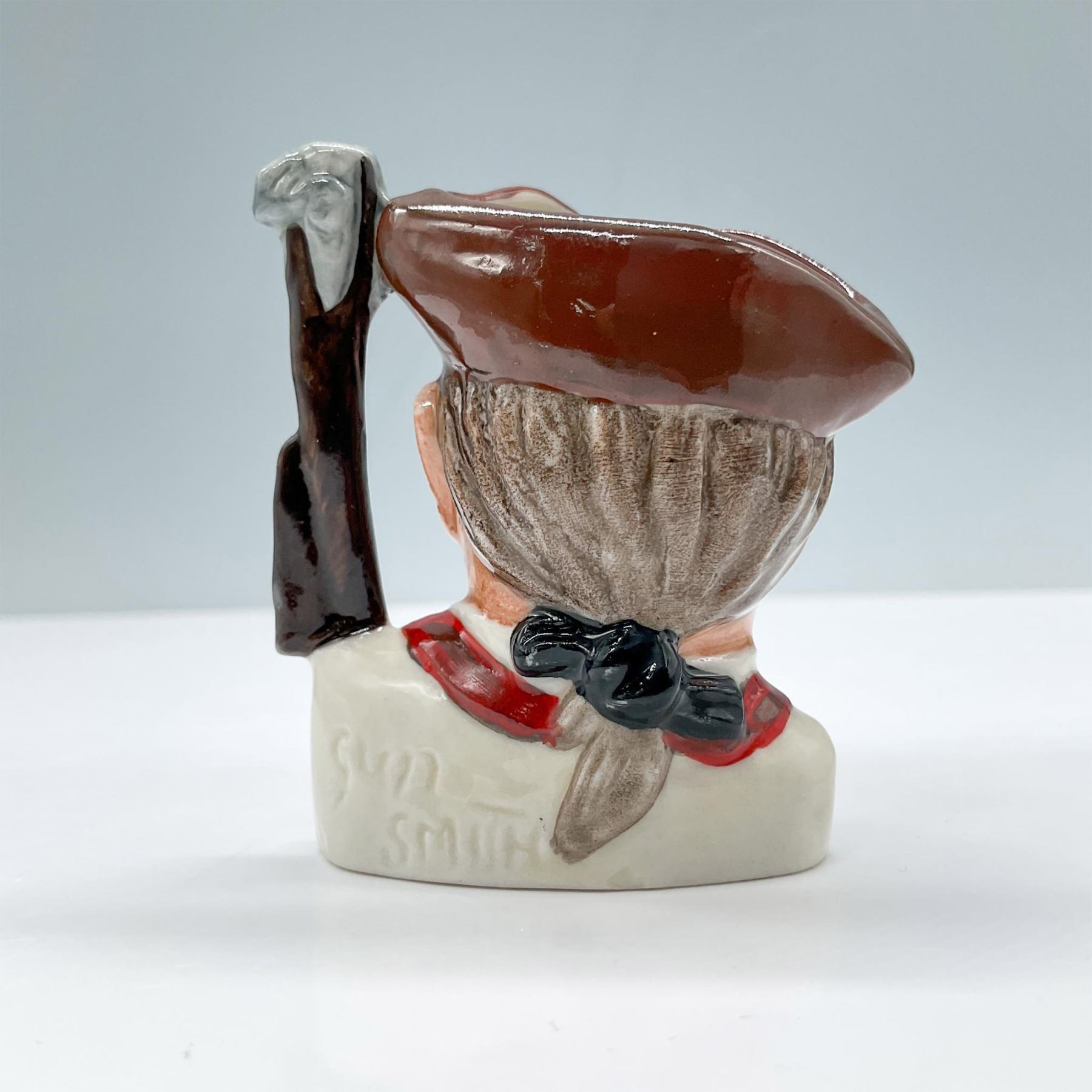 Part of the Character Jugs of Williamsburg series. White shirt, red apron, brown hat. Stock of a musket as the handle. Royal Doulton backstamp.