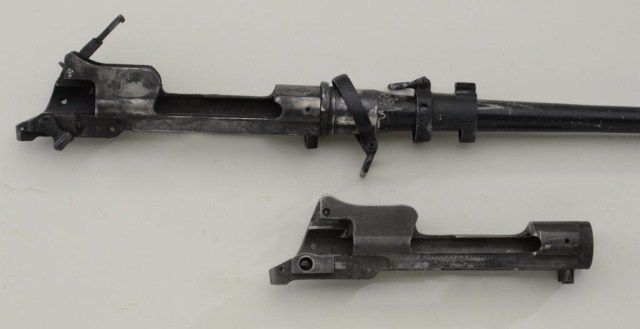 Gunsmith’s lot including a U.S. Model 1917 rifle receiver only by Winchester, #448159 and a U.S. Model of 1917 rifle receiver and barrel by Eddystone, #399627, with barrel bands and front sight; painted black and mayhave been in a fire. Est.: $150-$300.