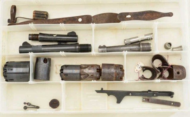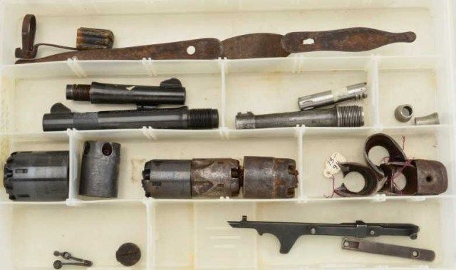 Gunsmith’s lot of misc. parts including 4 metal end caps for Winchester lever action rifles, a S&W DA barrel only, .38 S&W cal., a Colt New Service barrel in fine condition, .44 Russian and S&W Special caliber, misc.percussion cylinders, parts, etc. Est.: $100-$150.