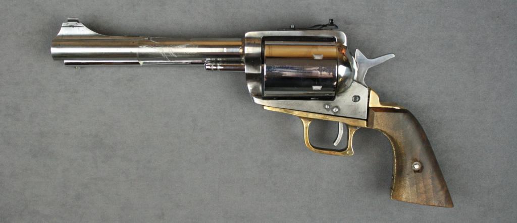 Gunsmith’s special project: a massive custom revolver in 45-70 cal., 8” barrel, nickel finish, brass straps, wood grips, barrel marked “Firearms Specialties, Owosso, Mich.”, #111. This gun is currently not functioning as the action parts are in a zip lock bag accompanying the rest of the gun. Likely hours of fun at the workbench making this hand cannon function. Sold as is. Est.: $300-$600.