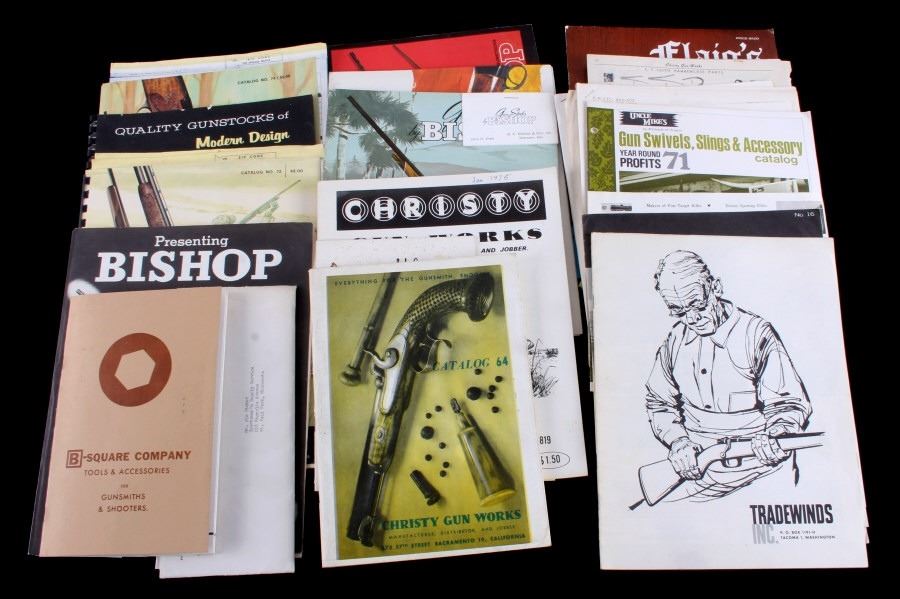 This is a large collection of gunsmithing parts books and catalogs. Included are catalogs from B-Square, Hodgman, Barnes, Tradewinds Inc., Flaig's, Christy Gun Works, Reinhart Fajen, and more. The collection is in good condition. The largest pieces measure 8.5" x 11".