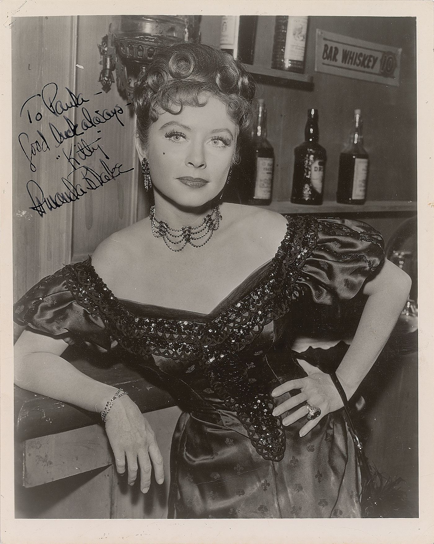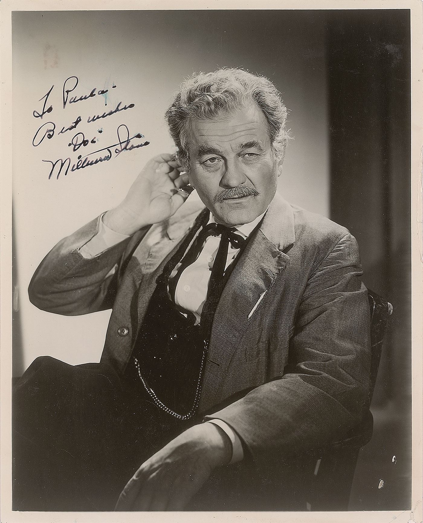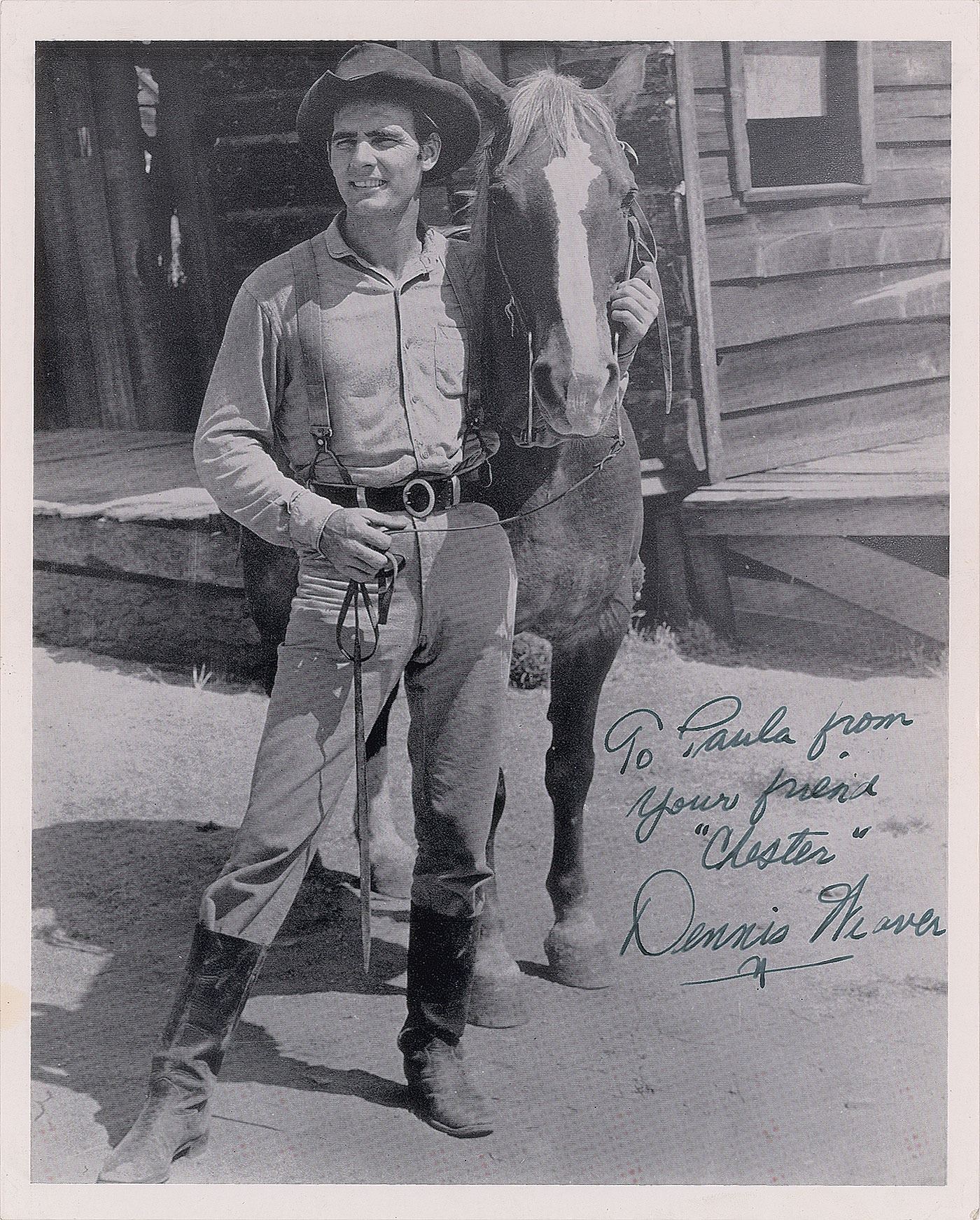 Group of three vintage photos of classic Gunsmoke characters from the enduring TV series, including: a vintage glossy 8 x 10 photo of Milburn Stone as Doc Adams, signed and inscribed in fountain pen, "To Paula—Best wishes, 'Doc,' Milburn Stone"; a vintage glossy 8 x 10 photo of Amanda Blake as Miss Kitty Russell, signed and inscribed in fountain pen, "To Paula—Good luck always, 'Kitty,' Amanda Blake"; and a vintage 8 x 10 cardstock photo of Dennis Weaver as Chester Goode, signed and inscribed in fountain pen, "To Paula from your friend, 'Chester,' Dennis Weaver." In overall fine condition, with slight brushing to Stone's signature, and tiny pinholes to borders of the Stone and Blake photos.