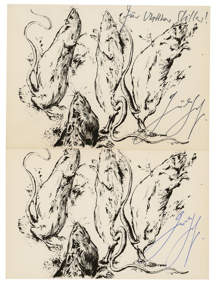 Two 5.75 x 4 postcards of a beguiling Gunter Grass drawing of a pack of rats, each signed in ink by the Nobel Prize winner (with one inscribed). In very fine condition. Accompanied by both original mailing envelopes.