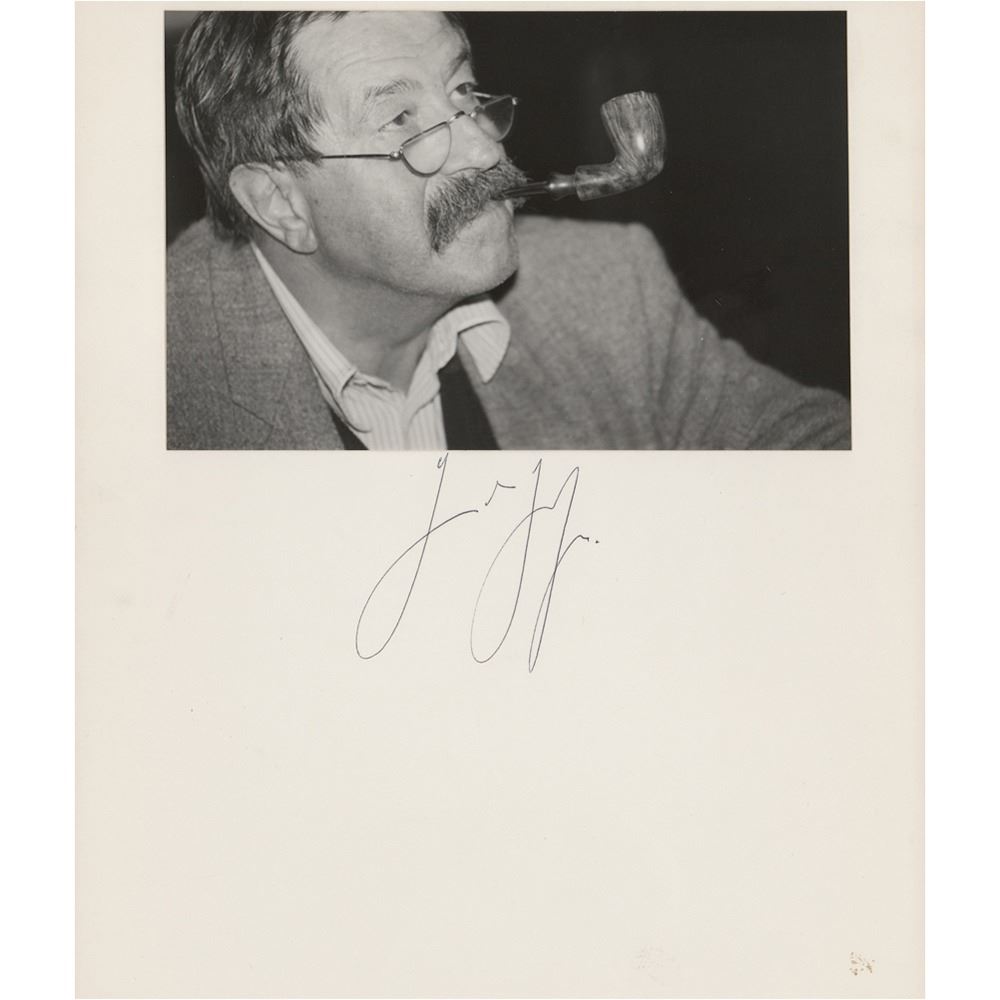 Semi-glossy 8.5 x 6.5 silver gelatin photo of Gunter Grass with a pipe in his mouth, affixed to the original 11 x 13.75 mounting sheet, signed on the sheet in black ballpoint by Grass. In fine condition, with a trivial stain to the lower right corner area. Originates from the personal collection of photographer Pamela Rankin-Smith, who was known for her unusual candid portraits.