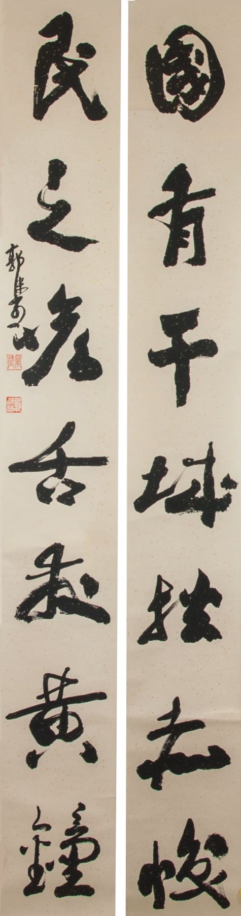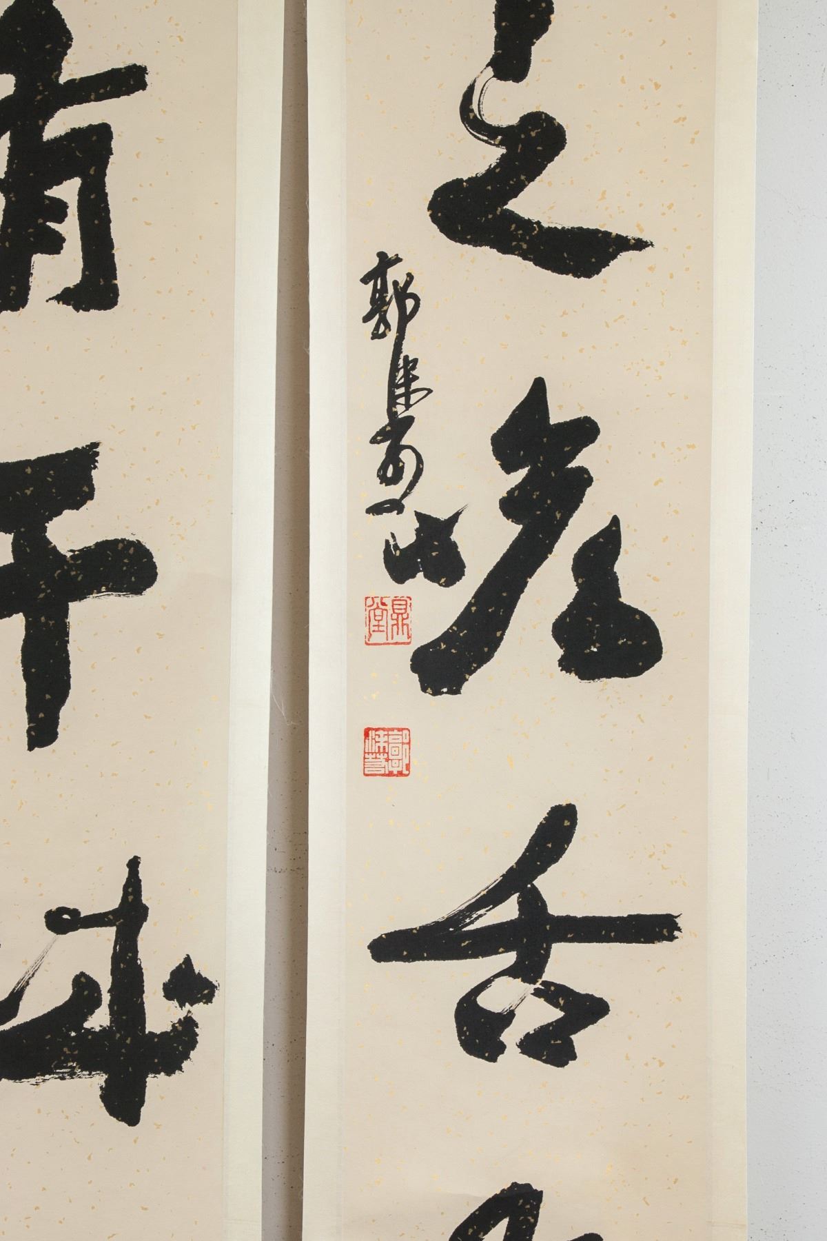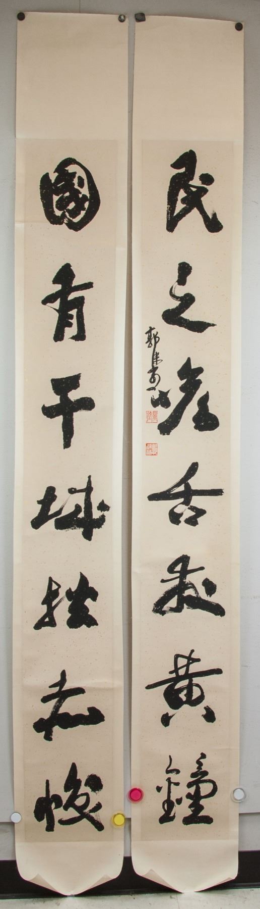 Pair Chinese calligraphy in semi-cursive script; Chinese ink on paper roll; signed Guo Moruo (1892-1978); inscribed with 2 artist seals; 180 cm x 23 cm