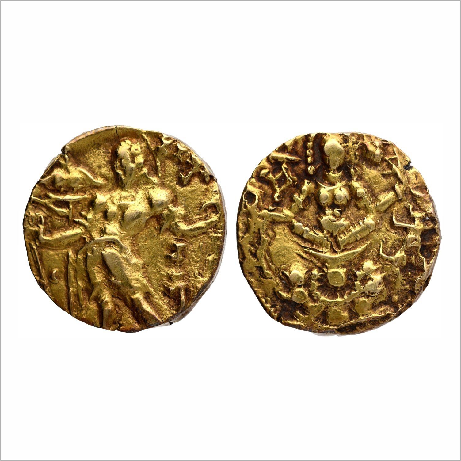Gupta Dynasty, Chandragupta II, Gold Dinar, "Archer" type, 7.8g, Obv: king standing facing left holding sword like arrow in his right hand and bow in left hand, Brahmi legend “Chandra” below king's arm, Rev: goddess Lakshmi seated facing on a lotus in Padmasana, Brahmi legend “Sri Vikramah” on the right filed.