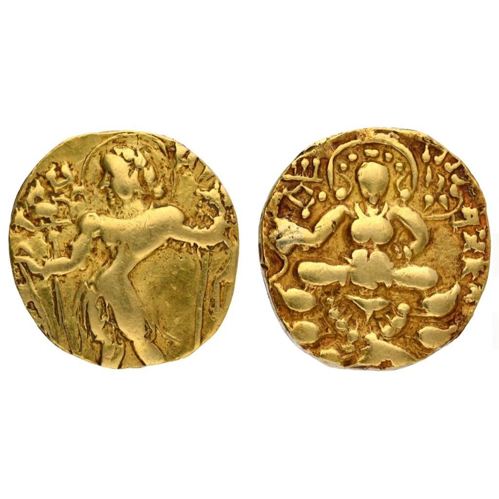 Gupta Dynasty, Kumaragupta I, Gold Dinar, "Archer" type, Without 'Ku', 7.97g, Obv: the king standing facing left, holding a long bow with his left hand and an arrow in his right, Brahmi legend "(Paramarajadhiraja, S Kumaragupta", Rev: the goddess Lakshm is seated in padmasana on a lotus, legend "Sri Mahendra"on the right field.