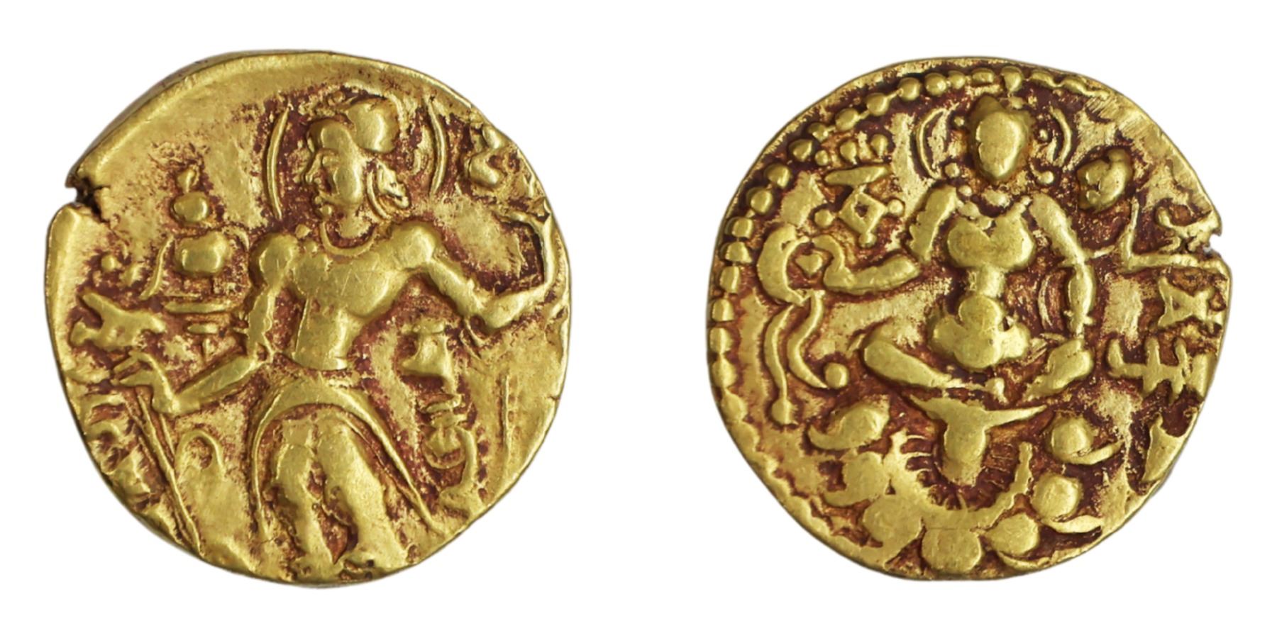 Chandragupta II, Gold Dinar, 7.76g, ‘Archer' type Obv: King nimbate with halo, standing left wearing coat, ear-rings, armlets and necklace, holding arrow in the right hand, left hand holding bow at top, 'Chandra' in Brahmi below arm, garuda standard behind and around traces of Brahmi legend, Rev: Goddess Lakshmi seated facing on a lotus, goddess has left hand resting on her knee, holding diadem in her right hand and lotus in left, tamgha to left field and Brahmi legend ‘Sri Vikramah' in the right field. (S.Kumar TOTGE # Class III, Var. A). Very Fine+, Rare.