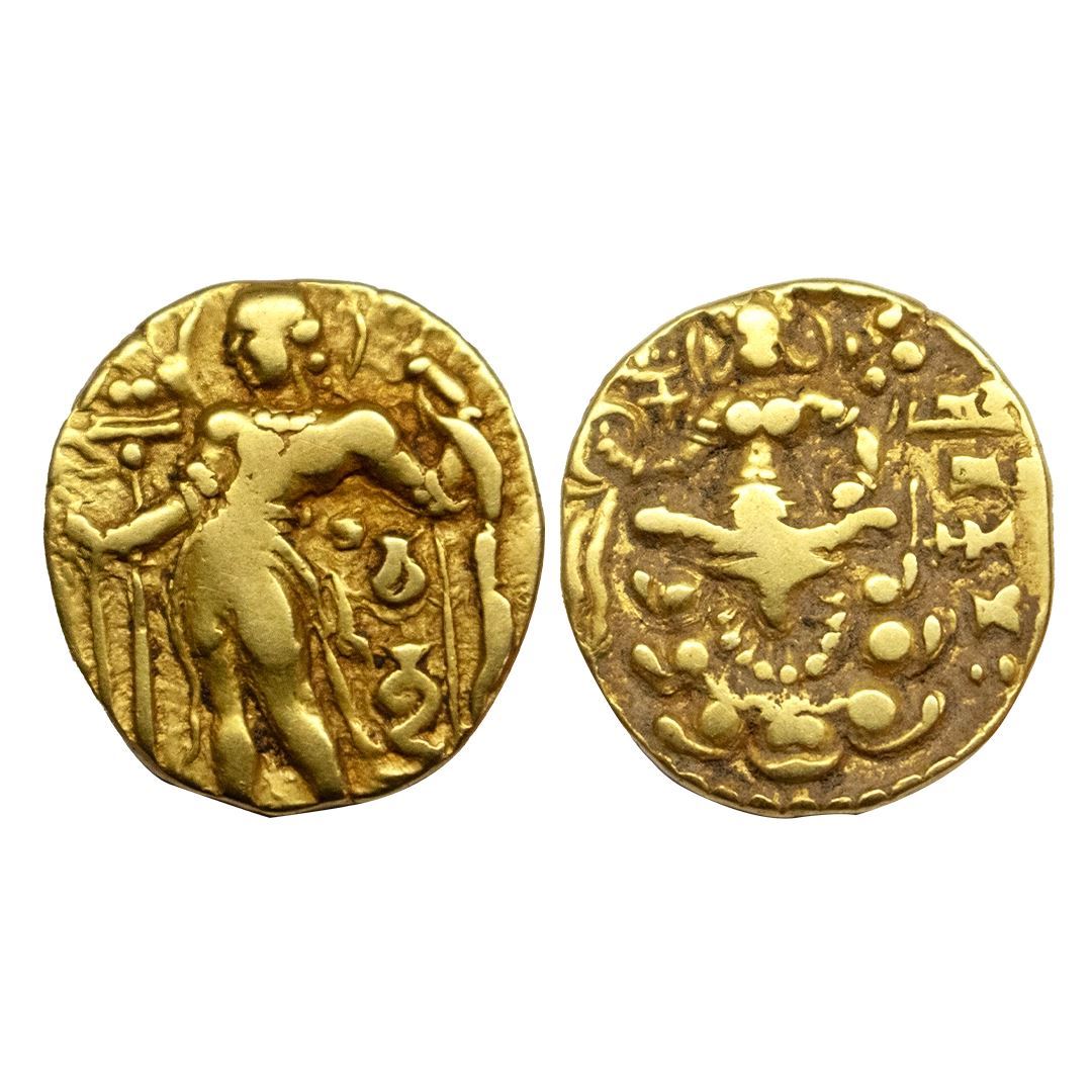 Gupta Empire, Chandragupta II (c. 375-415 AD), ‘Archer’ Type Gold Dinar, 7.80Grms, OBV: King nimbate, standing left wearing coat, ear-rings, armlets and necklace, holding arrow in the right hand, left hand holding bow at top, 'Chandra' in Brahmi below arm, garuda standard behind, around Brahmi legend off flan, REV: Goddess Lakshmi seated facing on a lotus, goddess has left hand resting on her knee, holding diadem in her right hand and lotus in left, tamgha to left and Brahmi legend ‘Sri Vikramah’ in the right field. (S.Kumar # TOTGE, Class III, Var. A).