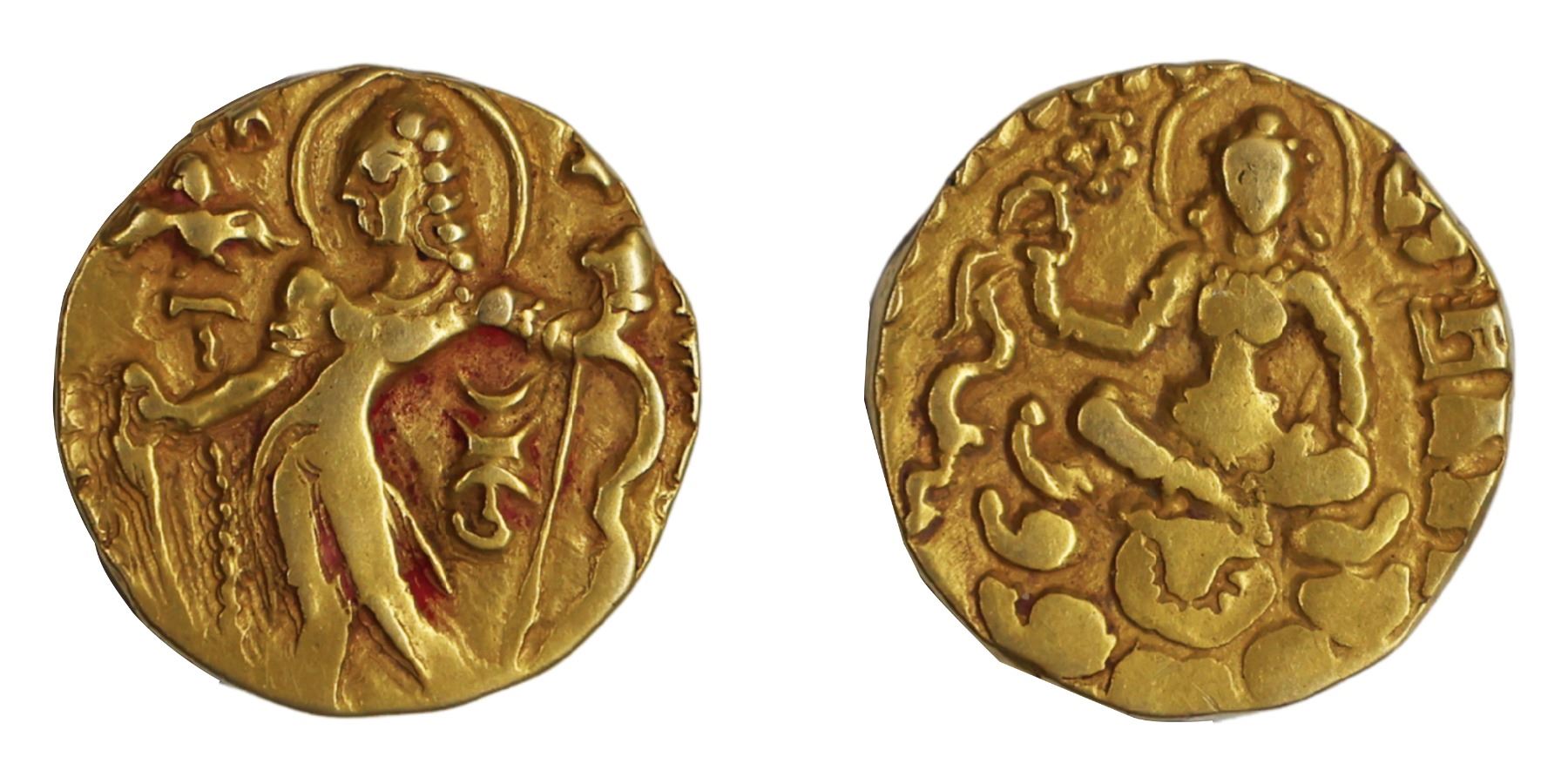 Kumaragupta I, Gold Dinar, 8.13g, ‘Archer' type, Obv: The king standing to left in Tri-bhanga position with halo, wearing a long coat and holding a bow in his left hand and holding an arrow in his right hand, a Garuda-Standard behind his right shoulder and Brahmi legend ‘Ku' above crescent in the right field, around traces of Brahmi legend Rev: Goddess Lakshmi seated on a lotus cross-legged with halo, holding a lotus with a big stalk and that is coming up near her left shoulder, and a pasha in her right hand and Brahmi legend ‘Shri Mahendra' in the right field. (S.Kumar # TOTGE, Class II, Var. A). Very Fine.