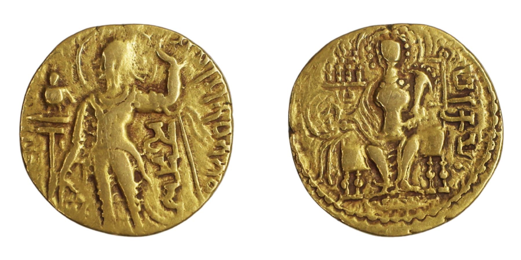 Samudragupta, Gold Dinar, 7.33g, ‘Javelin/ Standard' type, Obv: King nimbate standing left wearing coat, ear-rings, necklace and armlets, head surrounded by halo, offering oblation at altar on left side, garuda standard adorned with fillet beside king face, holding arrow in right hand, Brahmi legend ‘Samudra' under king's arm and around Brahmi ‘Samarashatavitata[vijayo jitaripurajito divam jayati]', Rev: Goddess Lakshmi nimbate seated on a throne facing, pearl-bordered diadem on head, holding noose in her right hand, cornucopiae in left hand with tamgha on left field and Brahmi legend ‘Parakramah' in the right field. (S.Kumar # TOTGE, Class II, var. A-6).Very Fine+.