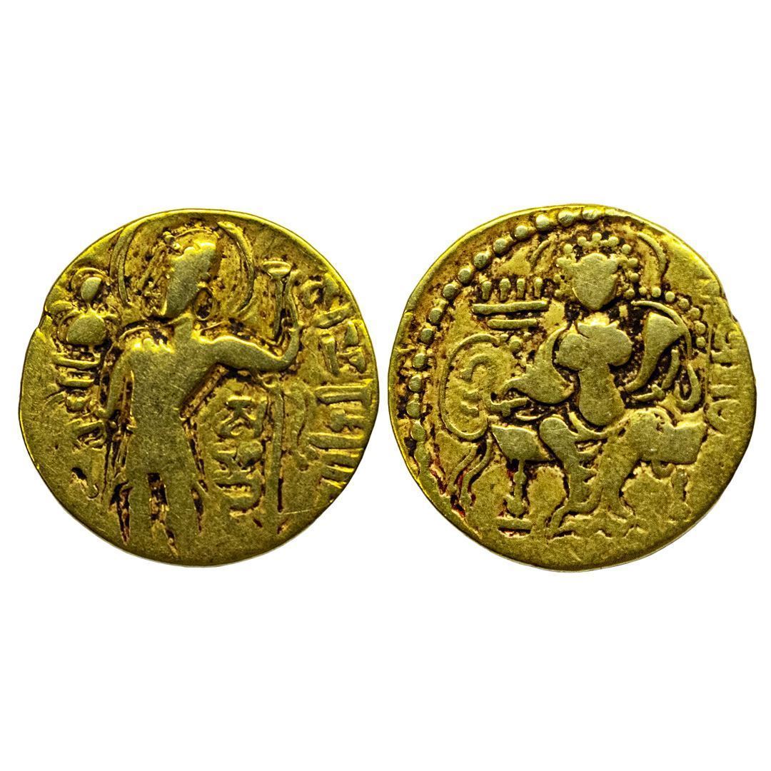 Gupta Empire, Samudragupta (c. 335-380 AD), ‘Javelin/Standard' Type, Gold Dinar, 7.36Grms, OBV: King nimbate standing left wearing coat, ear-rings, necklace and armlets, head surrounded by halo, offering oblation at altar on left side, garuda standard adorned with fillet beside king face, holding arrow in right hand, Brahmi legend ‘Samudra’ under king’s arm and around Brahmi ‘Samara Shata [VitataVijayoJitaRipurajito DivamJayati]’, REV: Goddess Lakshmi nimbate seated on a throne facing, pearl-bordered diadem on head, holding noose in her right hand, cornucopiae in left hand with tamgha on left field and Brahmi legend ‘Para[kramah]’ in the right field. (S.Kumar # TOTGE, Class II, var. A-6). Fine.