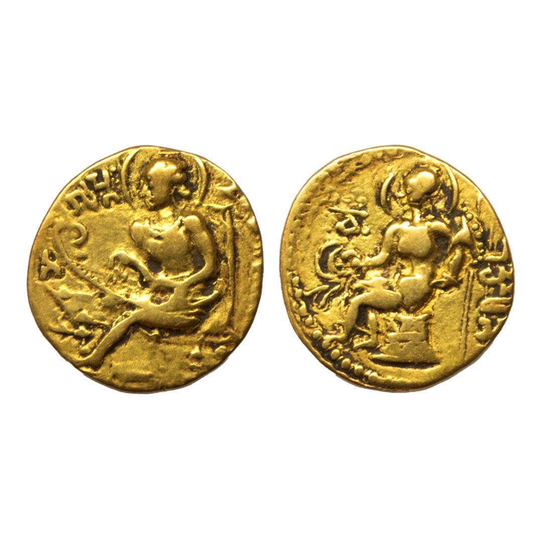 Guptas, Samudragupta (c. 335-380 AD), Gold Dinar, 7.68Grms, ‘Lyrist’ type, OBV: King seated on a high-backed throne, playing a veena (lute) with seven strings which is carrying on his lap, his left hand keeping the instrument in position and right hand manipulating strings of the instrument, king’s left leg hanging down while his right leg is folded on the conch and the toe of his right foot is touching the foot stool, Brahmi letter ’Si’ on footstool for siddham, around Brahmi legend ‘[Maharajadiraja sri Sa]mudraguptah’, REV: Goddess Lakshmi nimbate, seated left on a wicker stool, holding a diadem fillet in her right hand and a cornucopia in the left hand, tamgha on left field Brahmi legend ‘Samudraguptah’ in right margin. (Kumar # TOTGE var. B).