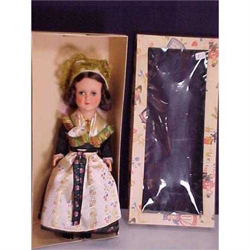 This is a beautiful doll dressed in a fabulous ethnic costume. She is marked HD on her neck and then the label on her box says: Gura Konstanz (Lake of Bodensee). I think she is celluloid or an early plastic. She would predate 1945 and probably go back to the 1930's. She is jointed in the legs and arms and has sleep eyes. The box is in very good condition with interesting graphics of German ethnic dancers. It is an attractive box.