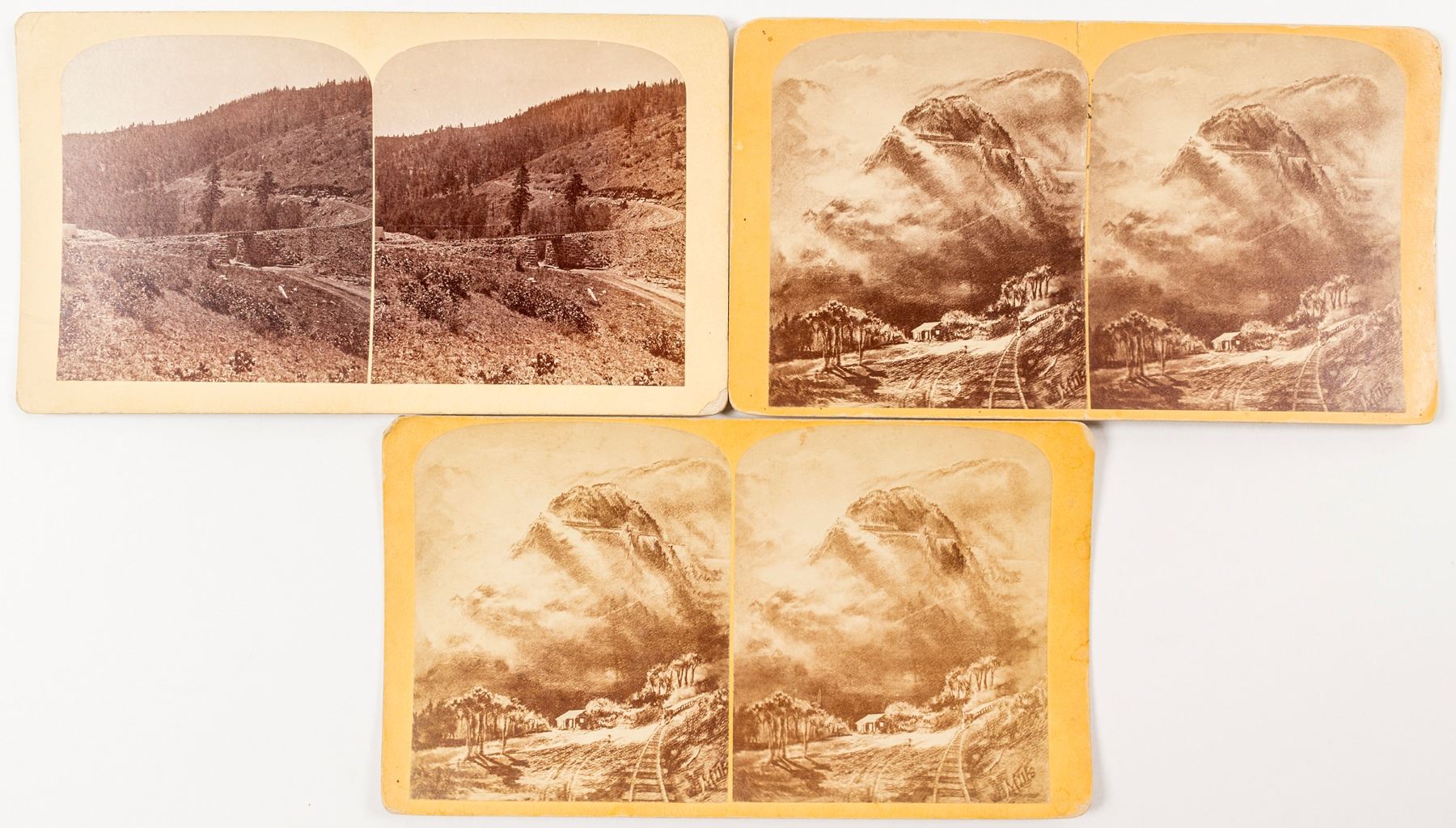 3 stereoviews by Gurnsey. The Mule Shoe and (2) The Railway on the end of Dump Mountain.