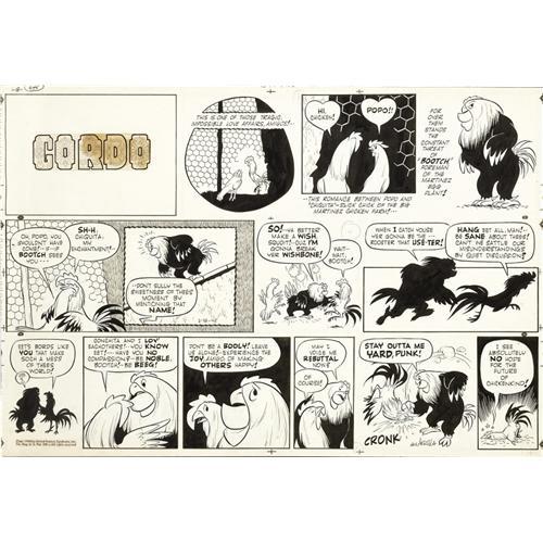 Gus Arriola presents a romance between rooster Popo, and Chiquita, a slick hen from the big Martinez chicken farm, in this imaginative Sunday. The image area measures 22" x 15", and the condition is Very Good. <BR><BR><b>Shipping:</b> Large Flat (<a target="_blank" href="http://www.heritageauctions.com/common/shipping.php">view shipping information</a>)