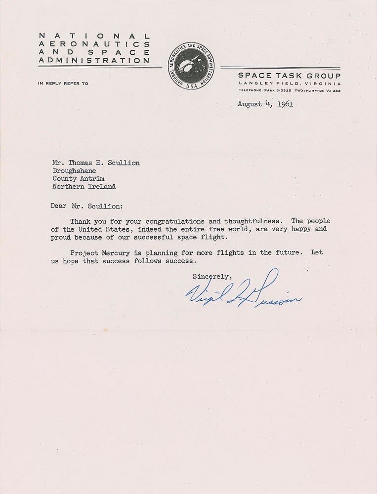 Very early TLS signed “Virgil I. Grissom,” one page, 8 x 10.5, NASA letterhead, August 4, 1961. Letter to Thomas H. Scullion, in full: "Thank you for your congratulations and thoughtfulness. The people of the United States, indeed the entire free world, are very happy and proud because of our successful space flight. Project Mercury is planning for more flights in the future. Let us hope that success follows success." In fine condition. Accompanied by the original mailing envelope. Less than three months after the flight of Alan Shepard's Freedom 7, Gus Grissom earned the distinction of becoming the second American to reach space when his Liberty Bell 7 launched on July 21, 1961. However, unlike the successful splashdown of Shepard, the premature opening of his capsule's hatch upon Atlantic touchdown nearly led to Grissom's drowning. Having already unbuckled most of his harnessing, Grissom was able to quickly free himself and escape from the sinking craft. After four to five minutes of treading water, an exhausted and relieved Grissom was lifted aboard a recovery helicopter. For his subsequent Gemini 3 mission, Grissom playfully named the spacecraft 'Molly Brown,' in reference to the Titanic's 'The Unsinkable Molly Brown' and his own harrowing experience. Grissom remains highly sought-after across all formats, with this letter all the more desirable given that it was written just two weeks after his inaugural spaceflight.