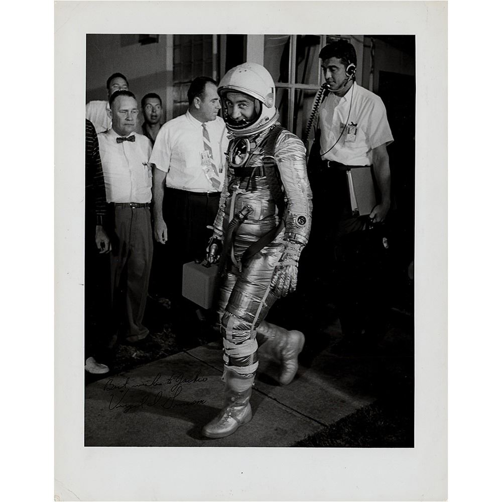 Scarce vintage glossy 11 x 14 silver gelatin photo of Gus Grissom peering out from under his Project Mercury helmet, signed and inscribed in fountain pen, "Best wishes to Jackie, Virgil I. Grissom.†In fine condition, with light creasing to the corner tips. Grissom is very scarce in this oversized format.