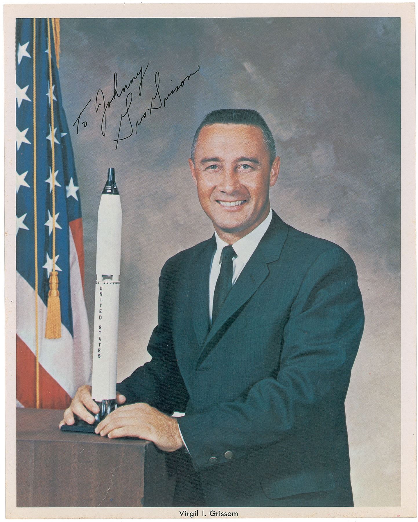Official color 8 x 10 NASA lithograph of Grissom posing with a Redstone rocket model in a formal half-length pose, neatly signed and inscribed in black ink, "To Johnny, Gus Grissom.” In very fine condition. A magnificent portrait of the commander of the star-crossed Apollo 1 mission—official NASA lithos signed by Grissom are highly sought after, with this example elevated furthermore by its uncommon pose.