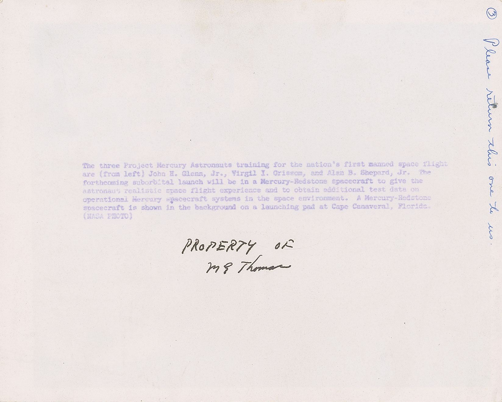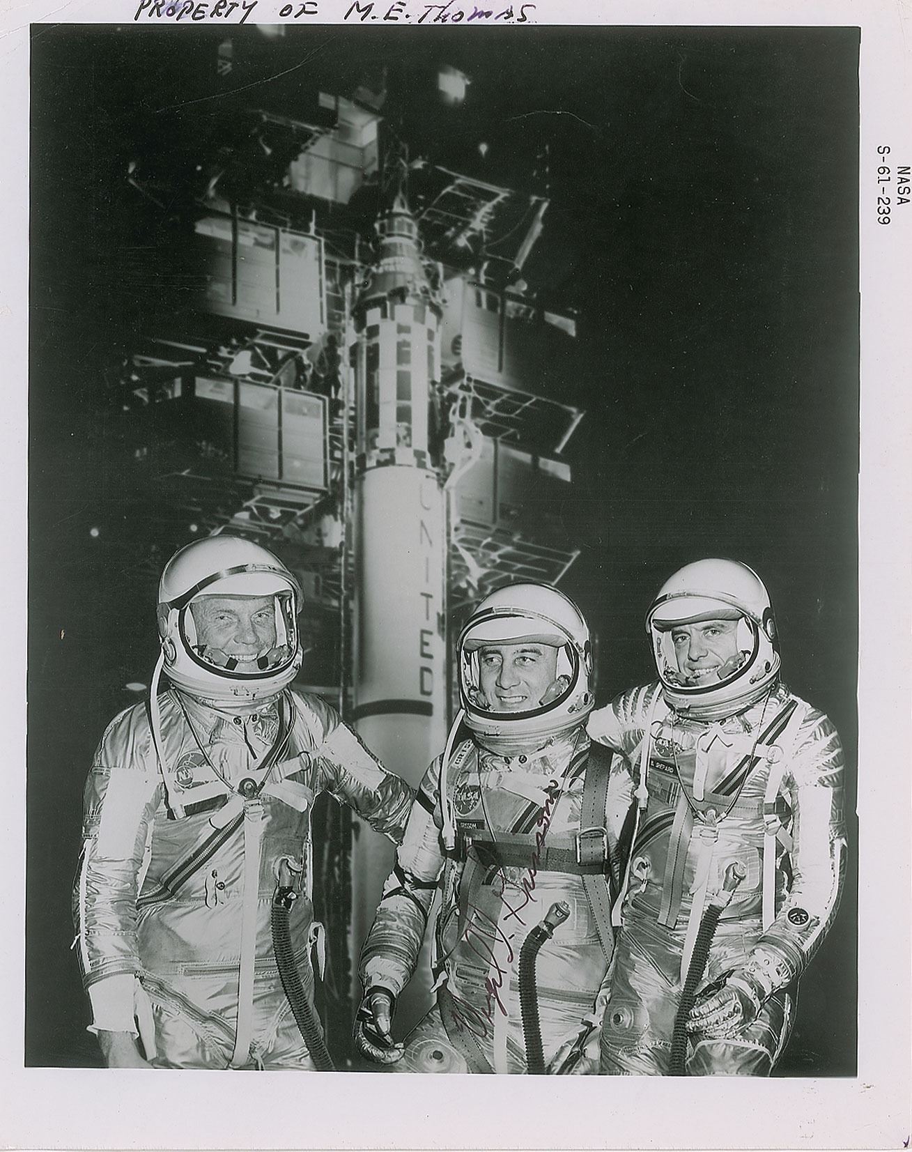 Vintage official glossy 8 x 10 numbered NASA photo of Mercury astronauts John Glenn, Alan Shepard, and Gus Grissom wearing their space suits and posing in front of the Mercury-Redstone Launch Vehicle, signed in black ink, "Virgil I. Grissom." Ownership notations to upper border and reverse, which also bears NASA caption text. In fine condition, with fair contrast to signature, a few small creases, and hints of silvering, only visible at an angle.