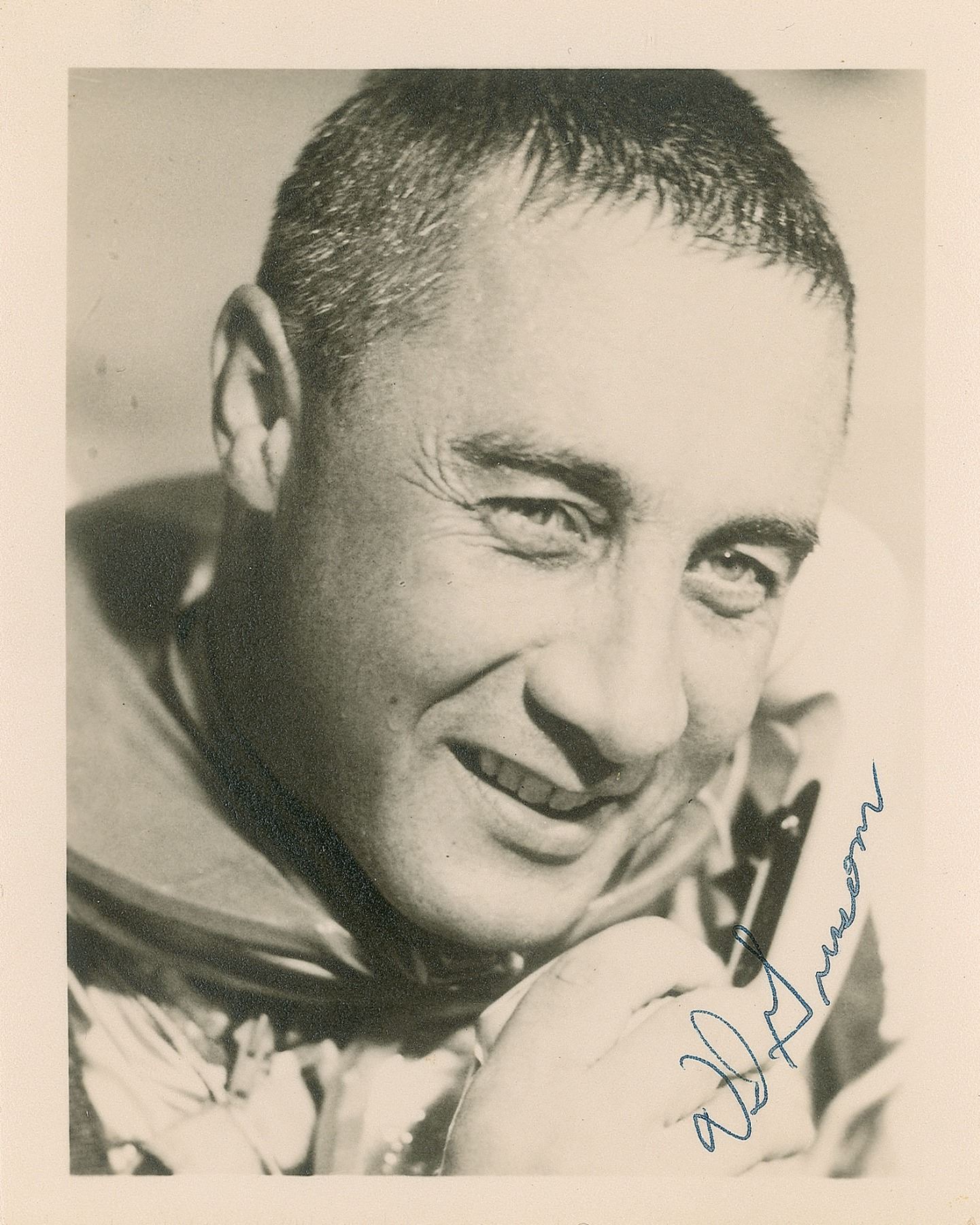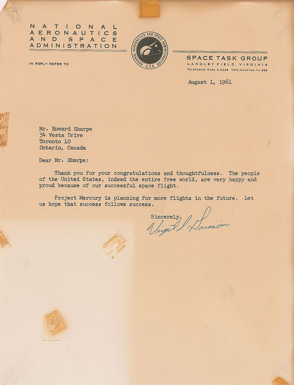 Two items: a TLS, signed "Virgil I. Grissom," one page, 8 x 10.5, NASA letterhead, August 1, 1961, addressed to Howard Sharpe, in full: "Thank you for your congratulations and thoughtfulness. The people of the United States, indeed the entire free world, are very happy and proud because of our successful space flight. Project Mercury is planning for more flights in the future. Let us hope that success follows success." The second item is a vintage matte-finish 4 x 5 close-up photo of Grissom wearing his Mercury space suit, signed in blue ballpoint, "V. I. Grissom." This photo was taken aboard the USS Randolph after Grissom was plucked from the Atlantic Ocean on July 21, 1961. He is receiving a congratulatory phone call from President John F. Kennedy. In overall very good to fine condition, with tape stains and toning to the letter, not affecting the signature; the signed photo is fine.